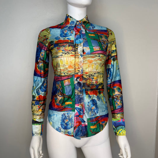 1970s Day Glow Psychedelic Surrealist Art Long Sleeve Blouse, L.A. Station by Arpeja Size XS