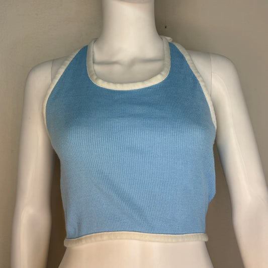 1970s Light Blue Knit Crop Top, Open Back, Talia Fashions Size XS-Small
