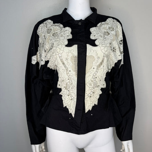 1980s Black Blouse with Lace Inserts, Side Buckles, Trash Clothing Size S/M, Embellished with Studs Rhinestones and Pearls
