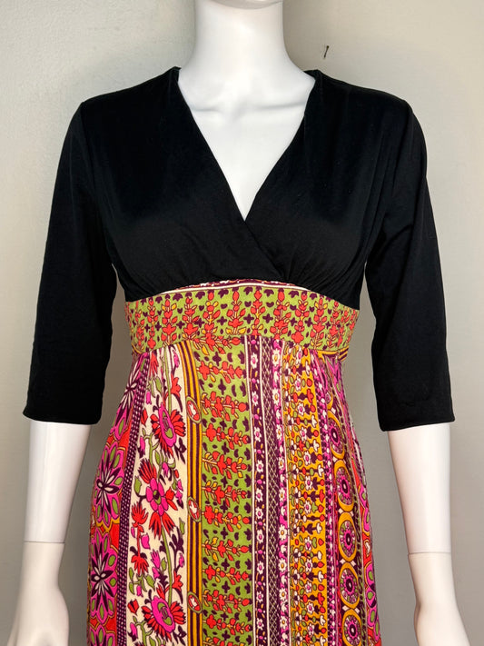 1970s Psychedelic Floral Stripe Maxi Dress, Border Print, Size Small