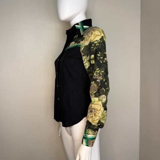 1970s Women’s Black and Green Floral Western Shirt, The Susan Alamo of Nashville Size XS, Tony Alamo, Country Music