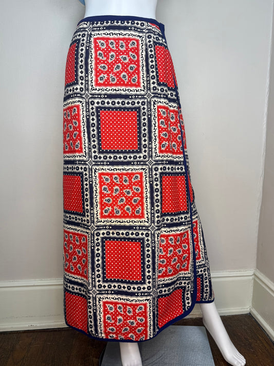 1960s/70s Bandana Print Maxi Wrap Skirt, by David Smith Size Small, Red White & Blue
