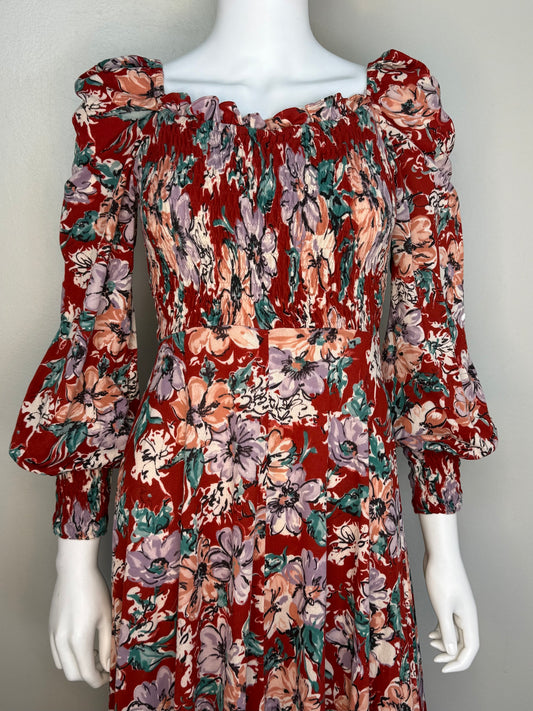 1970s Red Floral Maxi Dress, Jody T Size XS, Long Sleeve, Smocked Bodice, Full Skirt