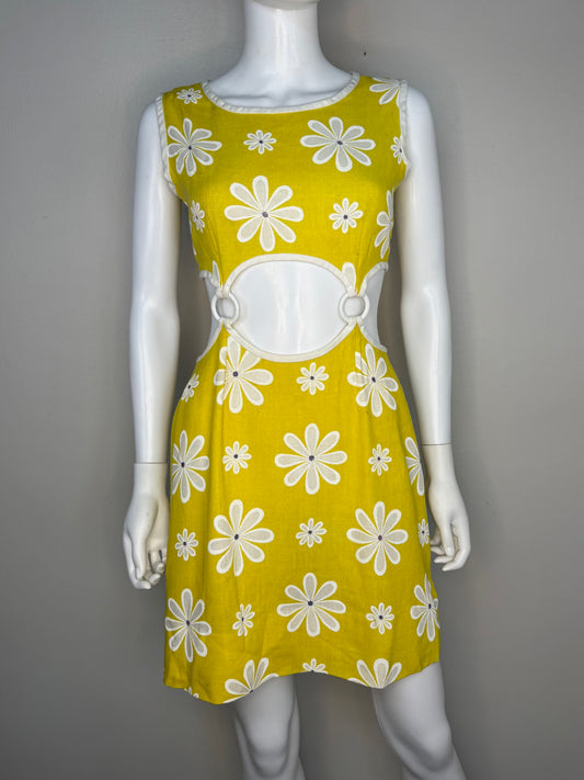 1960s Yellow Floral Mini Dress with Cut Outs and Rings, Handmade Size Small
