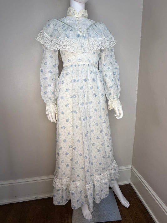 1970s White and Blue Floral Maxi Dress, Helen Joy Fashions Size XS/S, Prairie Cottagecore