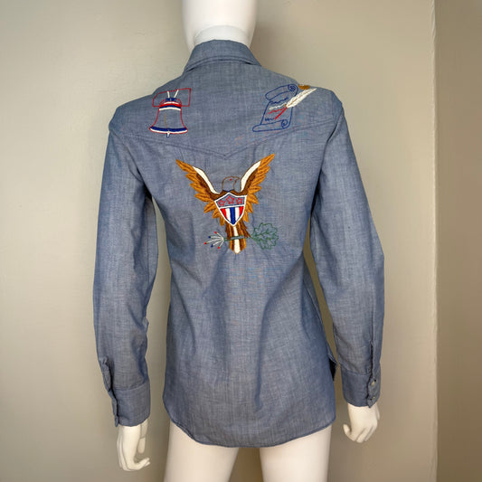 1970s Chambray Shirt, Hand Embroidered, Wrangler Size XS/Small, 1976 USA Bicentennial Celebration, Americana Embroidery