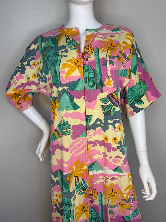 1960s/70s Psychedelic Egyptian Print Caftan Dress, Handmade Size Medium, Egyptomania