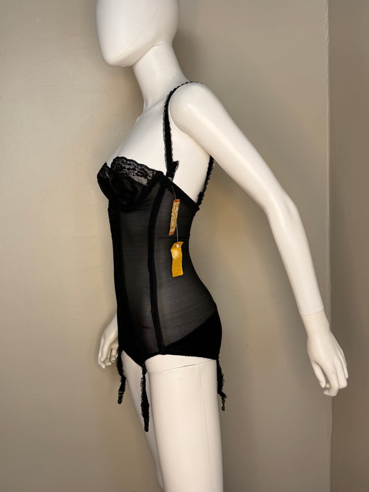 1980s Black Lace Bustier Shapewear Bodysuit, La Shapeur by Young Smoothie Size 34B, Torselette with Detachable Straps and Garters, Deadstock with Tags