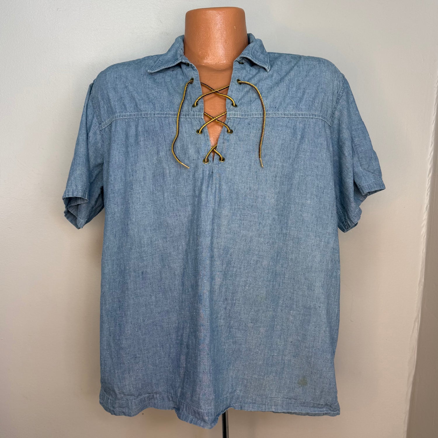 1960s Lace Up Chambray Shirt with Hippie Counter Culture Protest Print, The Surfer Size Large, Free Our Dorm