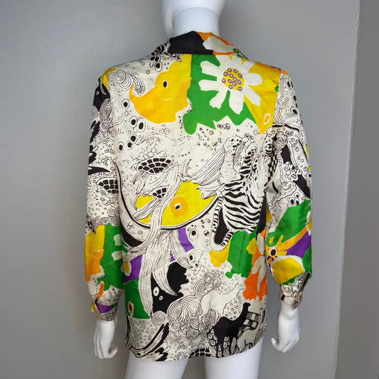 1970s Psychedelic Animals Print Long Sleeve Blouse, Size Medium