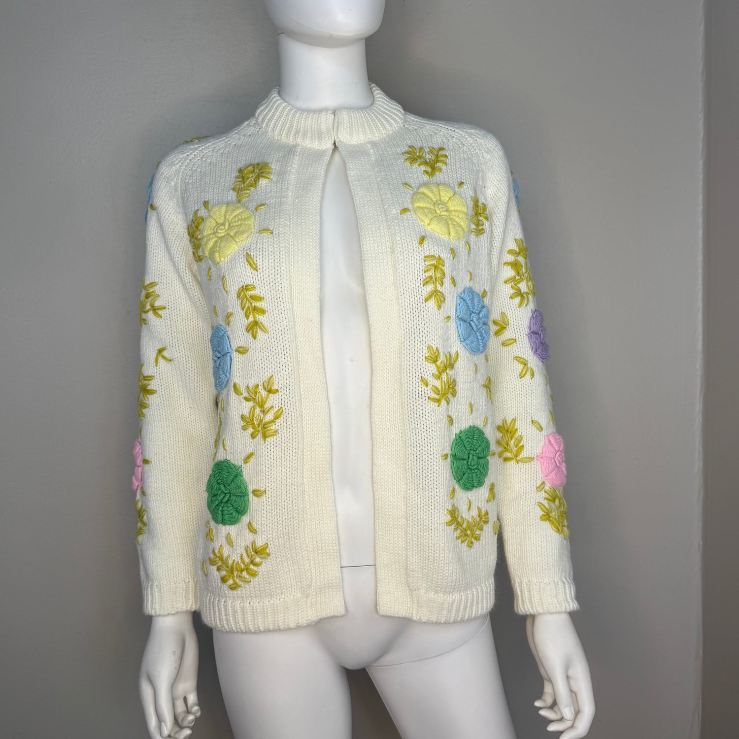 1960s/70s Floral Embroidered Cardigan Sweater, Glamour Knit Size Medium