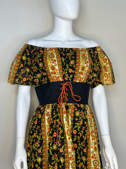 1960s Black and Orange Floral Peasant Dress with Corset Waist, Carol Brent Size Small-Medium, Montgomery Ward