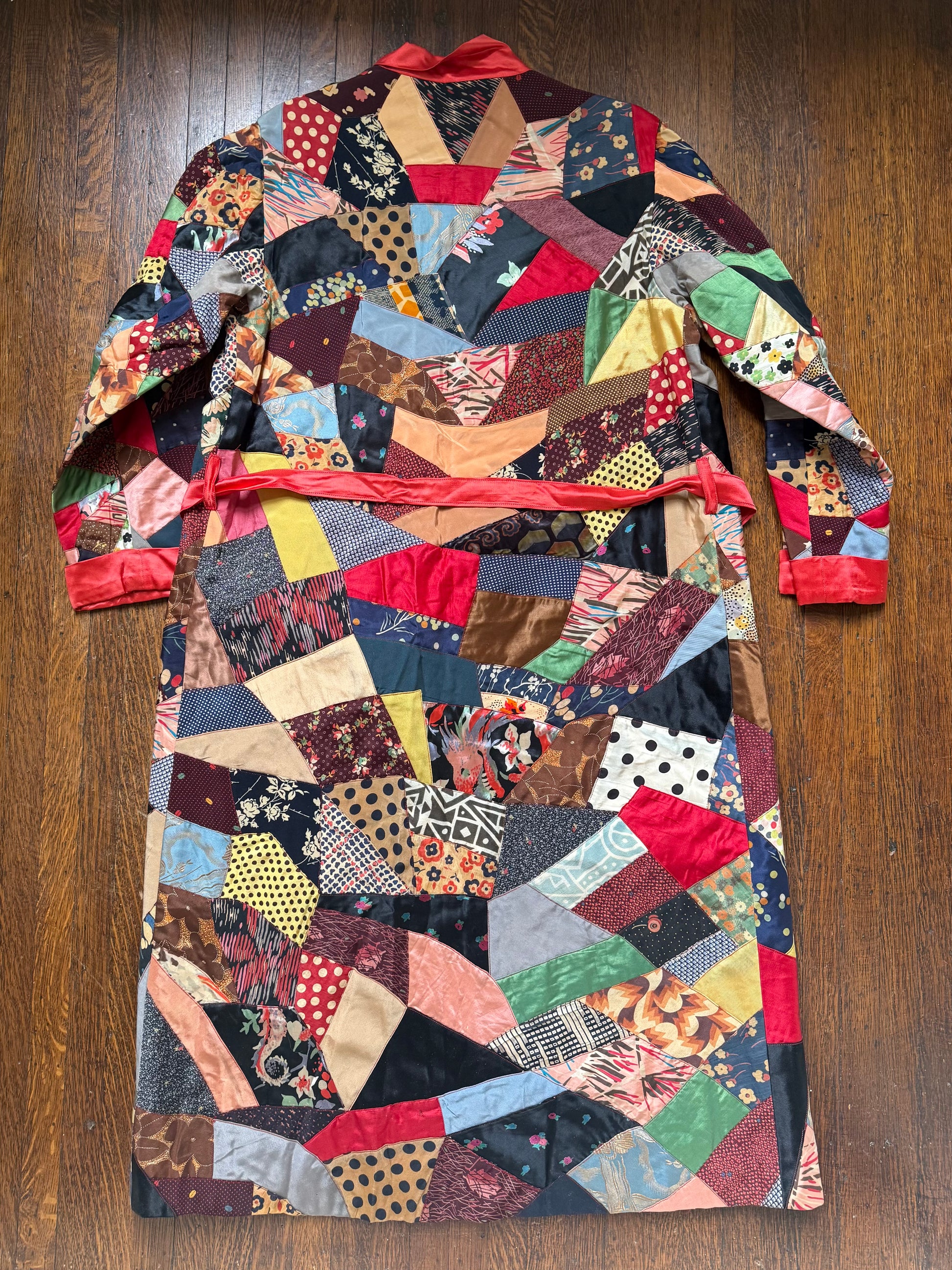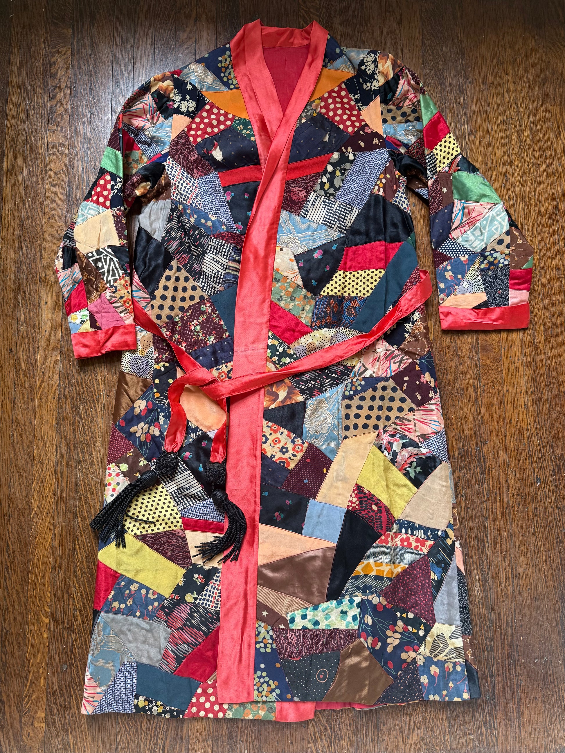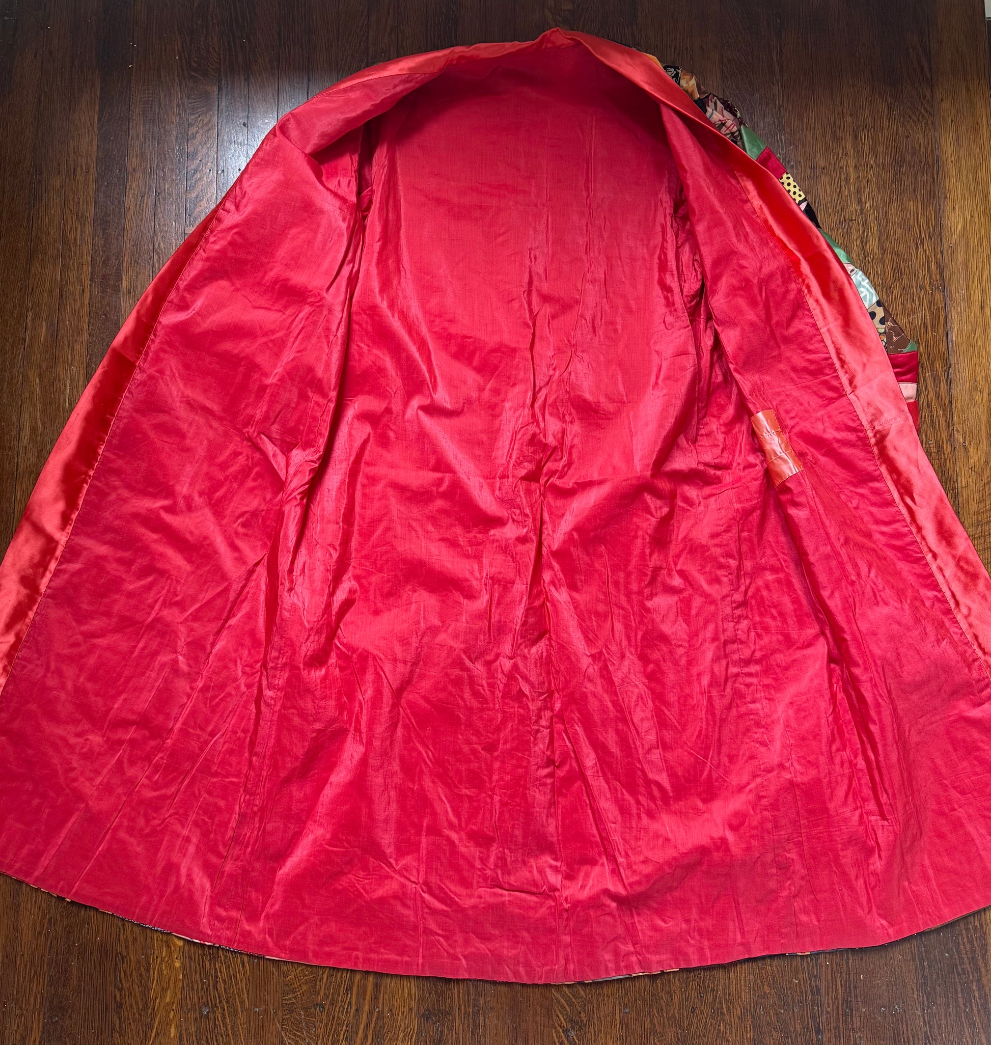Description - This antique robe is truly a work of art! So much love and skill was put into this piece. I am thinking that it was possibly made from old ties and garments with many cool art deco prints. It is fully lined and trimmed in red and comes with a matching red belt. The belt has black fringe on the ends. There is a small pocket inside.