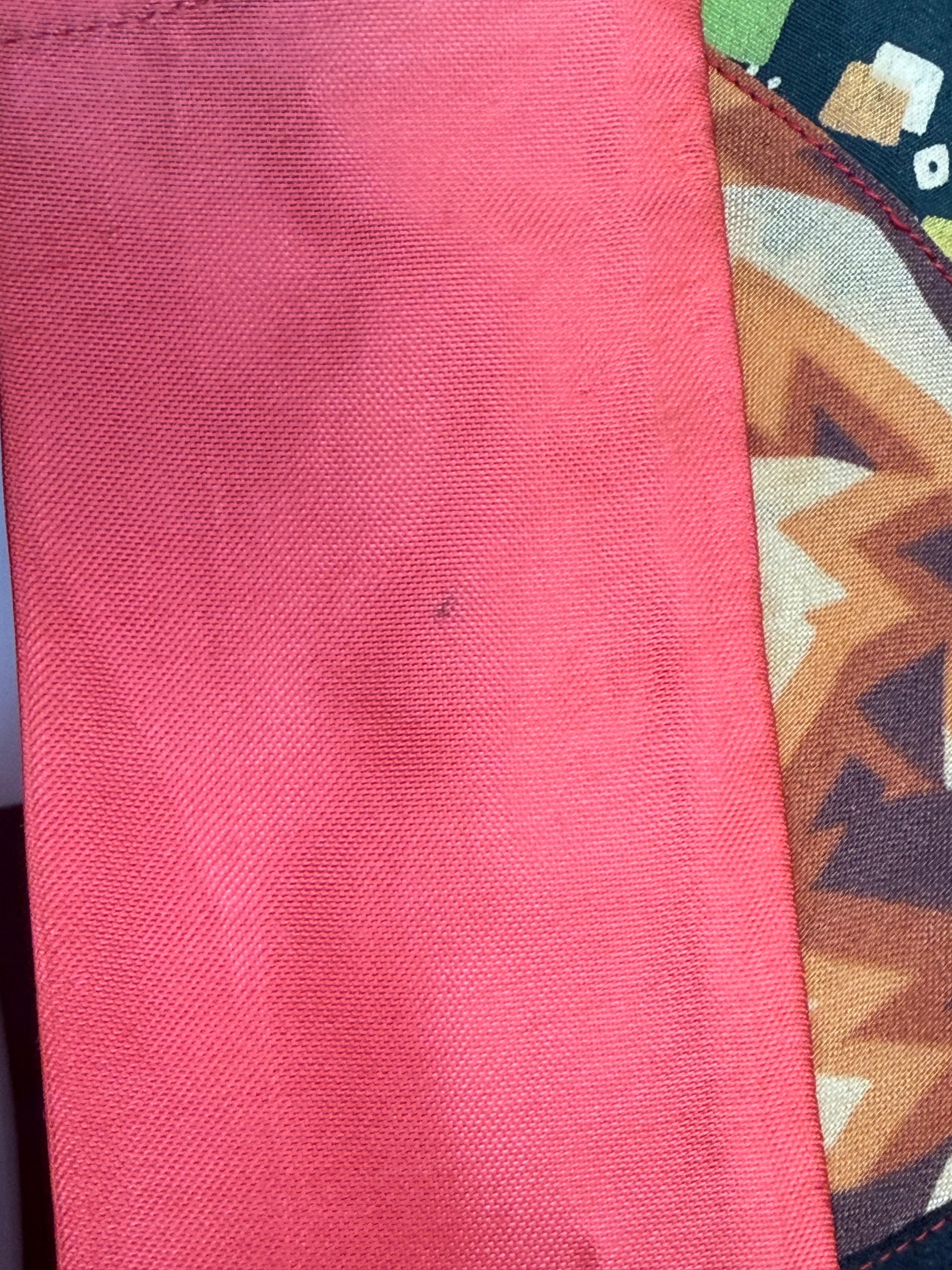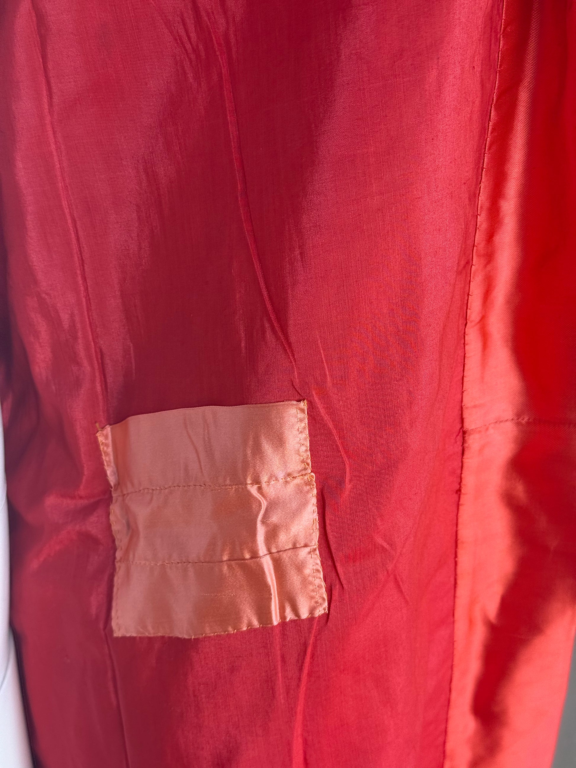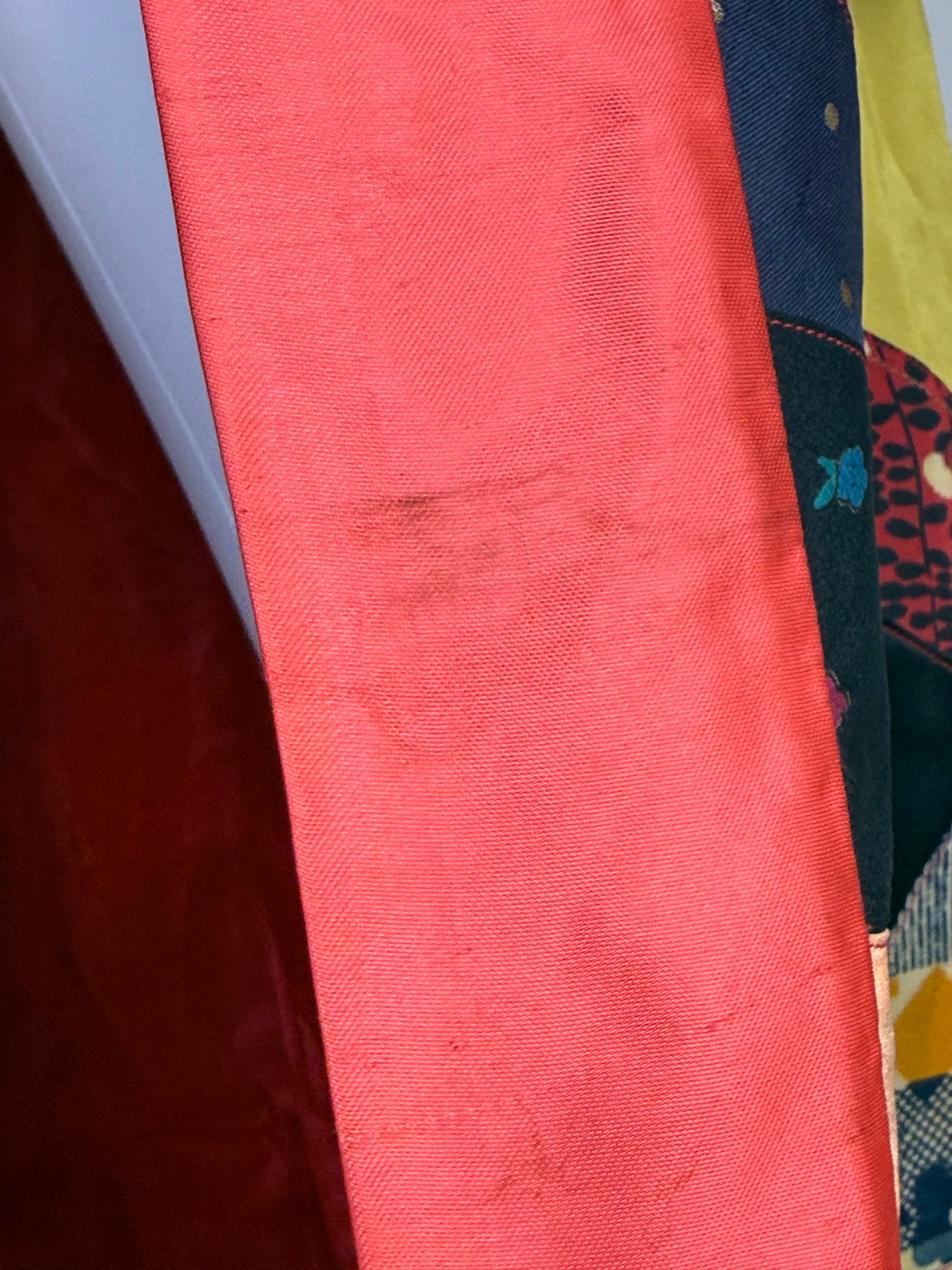 Description - This antique robe is truly a work of art! So much love and skill was put into this piece. I am thinking that it was possibly made from old ties and garments with many cool art deco prints. It is fully lined and trimmed in red and comes with a matching red belt. The belt has black fringe on the ends. There is a small pocket inside.