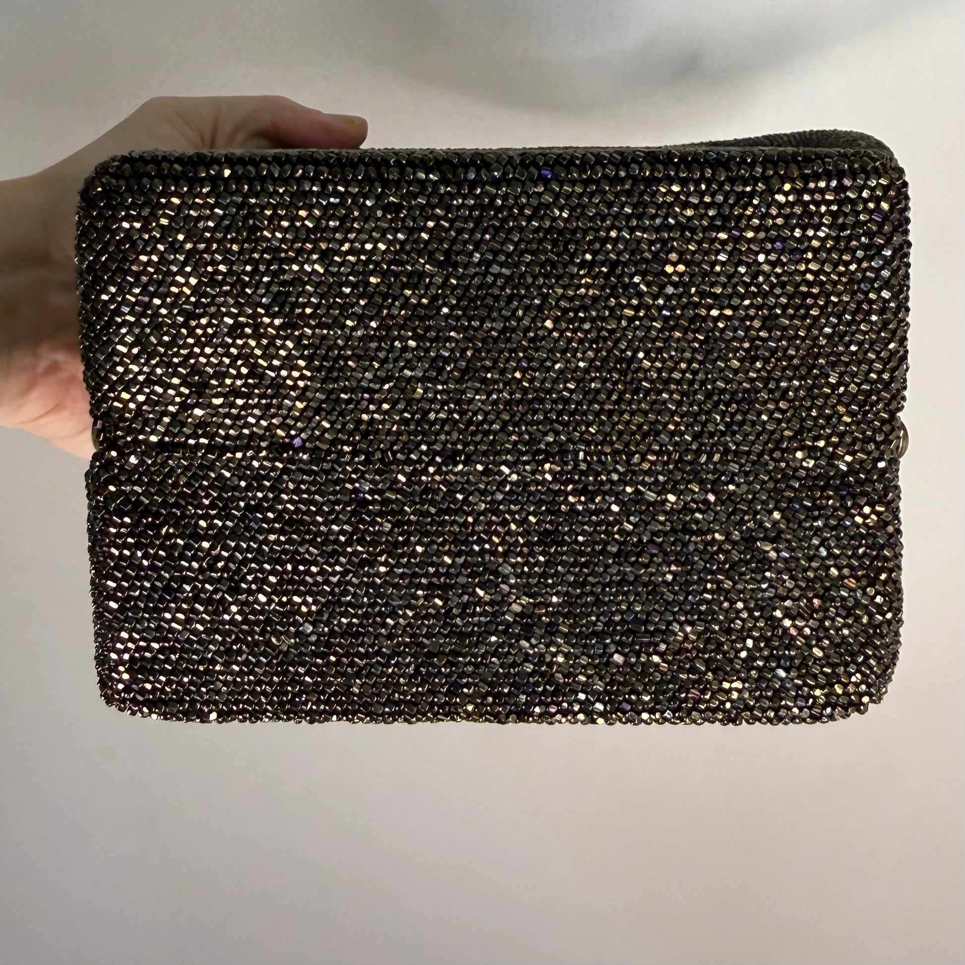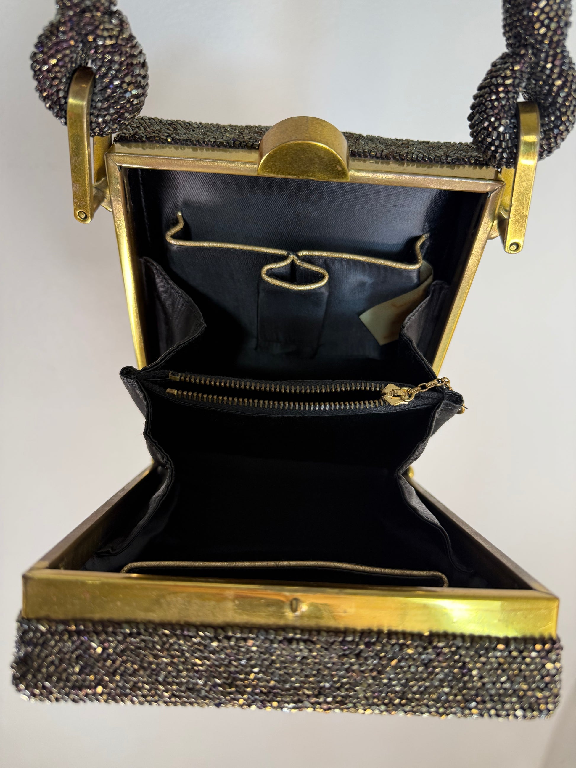 Description - Beaded box purse from the late 40s or early 50s. It has several sections inside including one in the center that zips closed. It's kind of hard to say what color it is but it looks kind of like a dark brown/bronze color with gold tone trim.