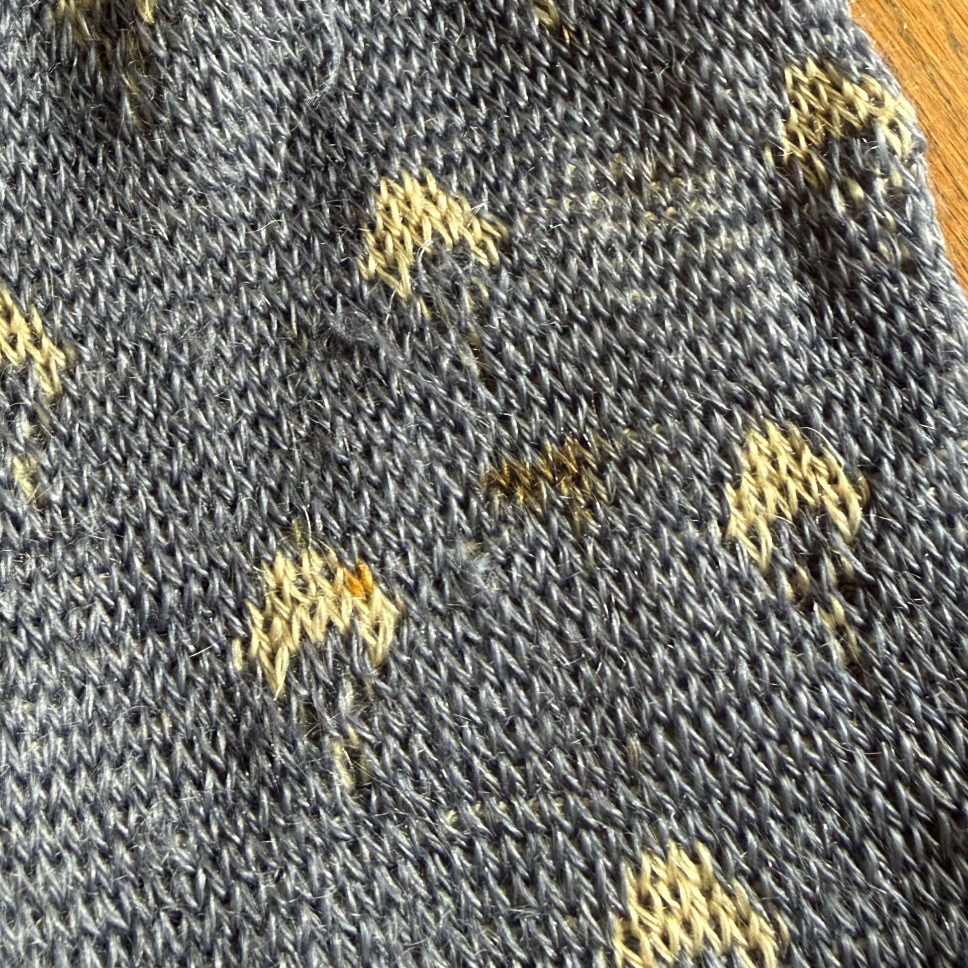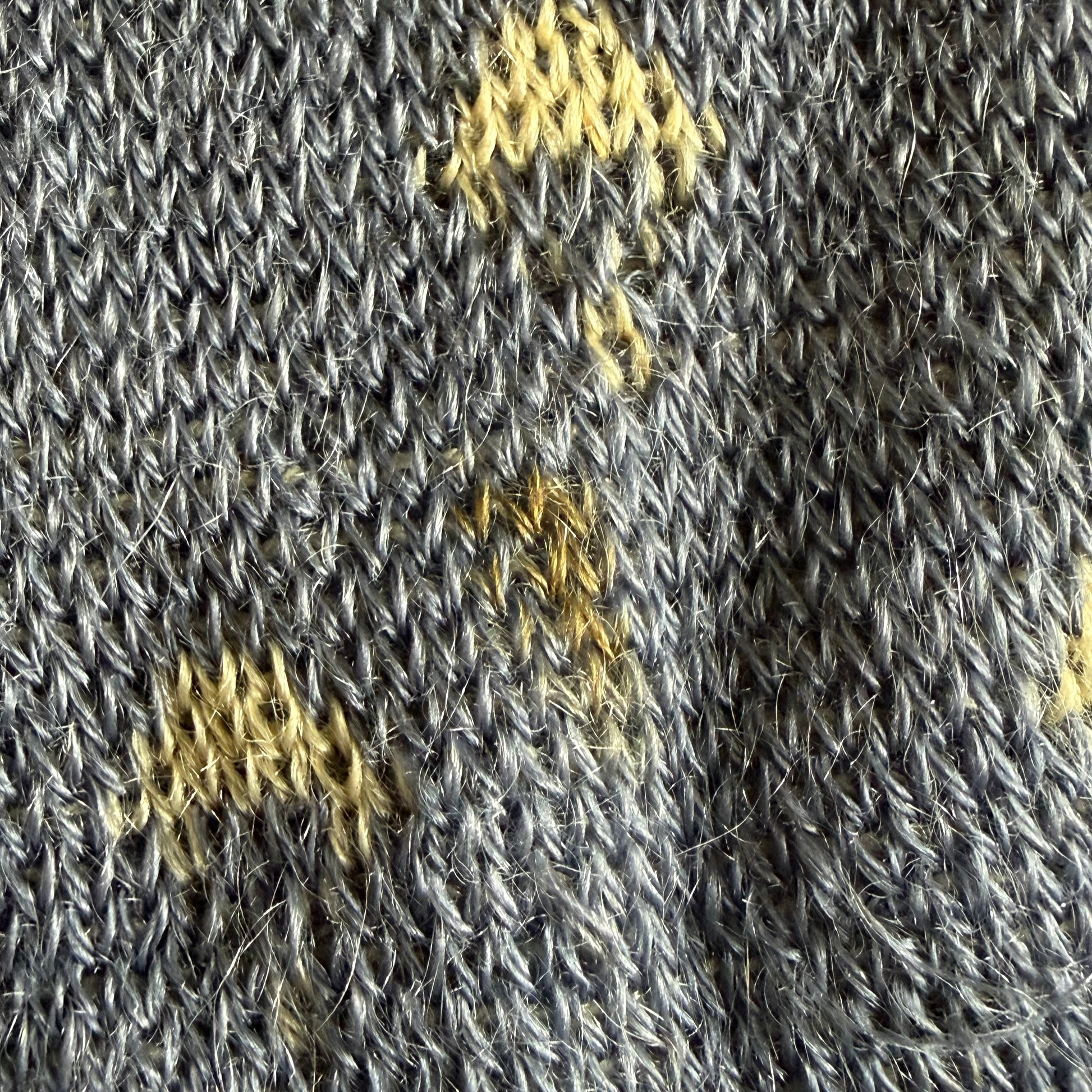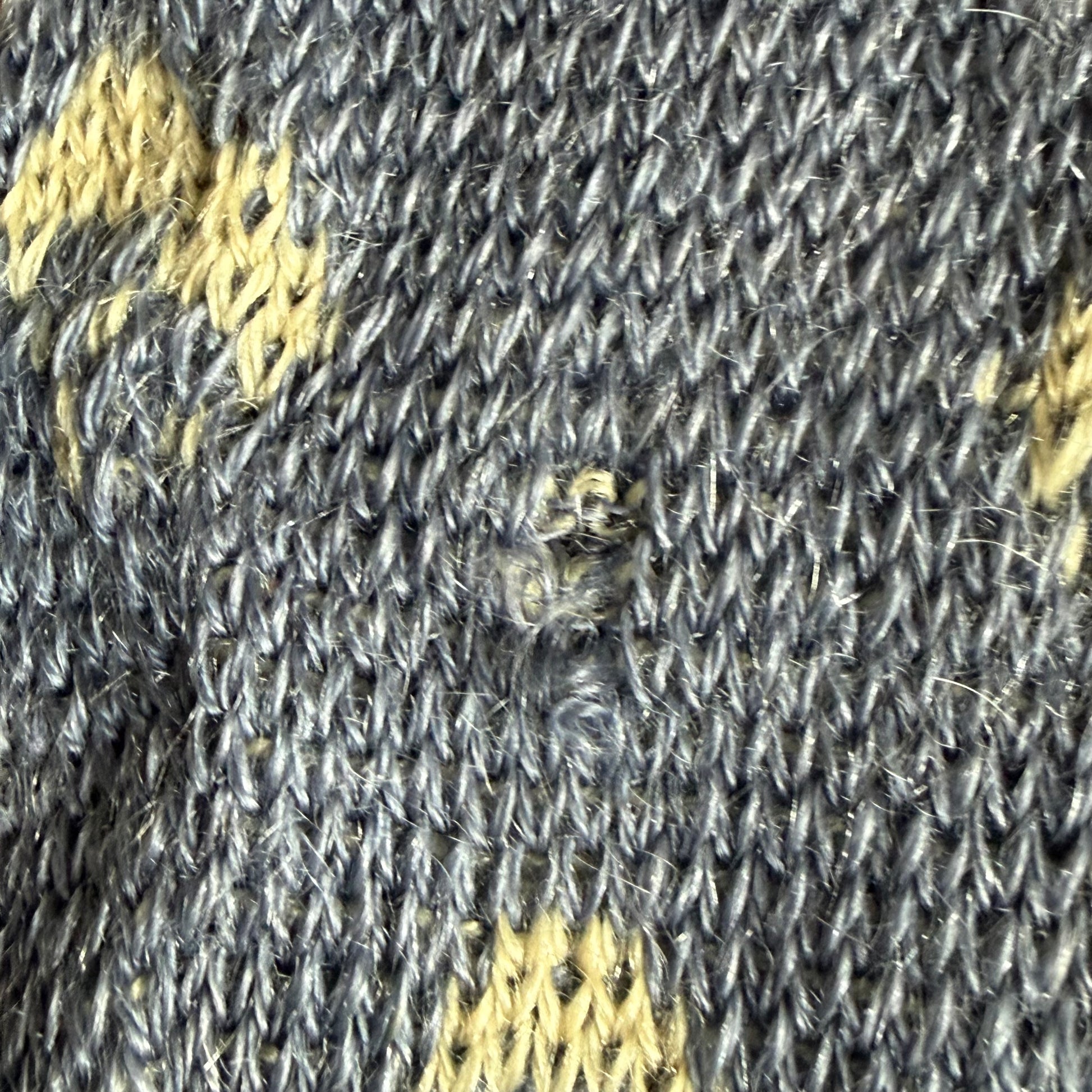 Condition - There are numerous holes and stains and a few old mends. There underarms are a little fuzzy. Please look through the photos. I tried to document all of the flaws I saw but I could have missed small ones. It is definitely not perfect but it is very wearable! I am selling this as found because I do not feel comfortable washing it so the staining could possibly come out.