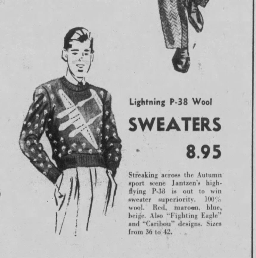 "The Jantzen P-38 sweater features as authentic design of the fastest, fiercest fighter jet in the air! An all-wool, all purpose sweater knitted in an exclusive Jantzen stitch to give you a sturdy, warm sport sweater"