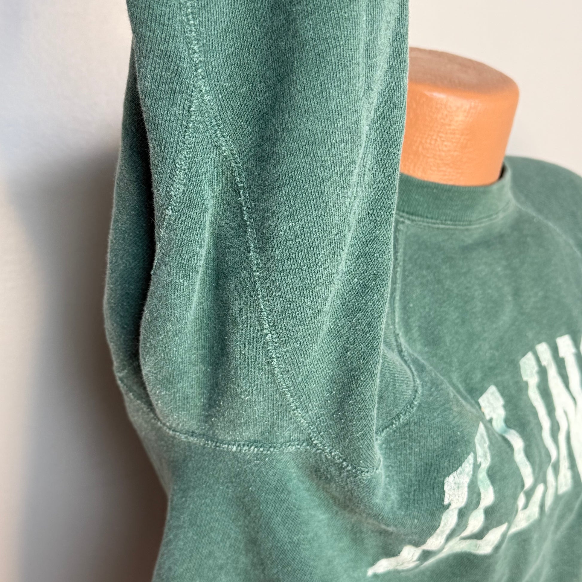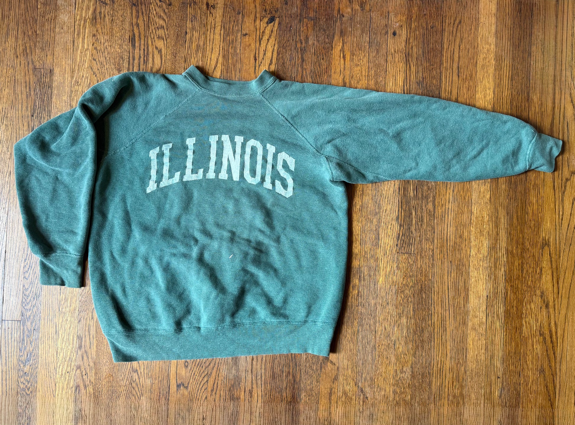 Description - Nicely faded green Illinois sweatshirt that I believe is from the 50s or 60s. It has raglan sleeves with underarm gussets and is on the thicker side.