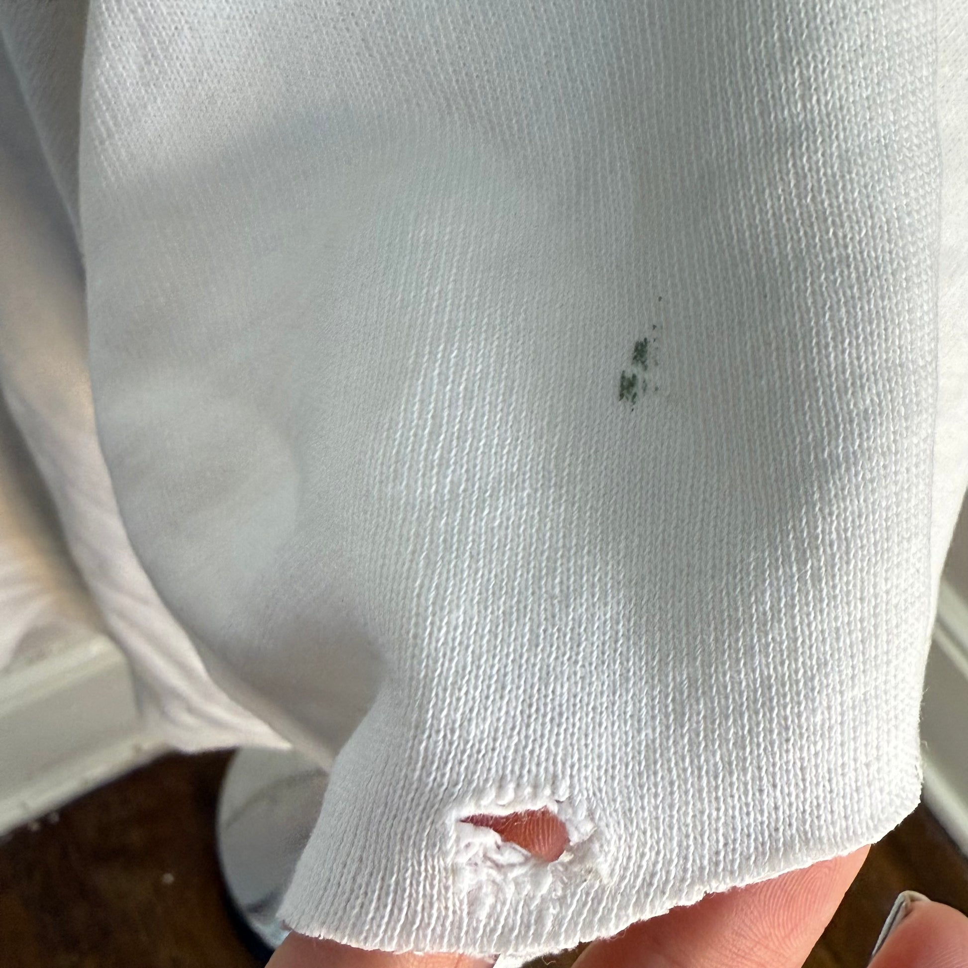 Condition - It is very distressed. The sleeves are chopped off and the edges are raw. There are a lot of paint stains. There are holes and wear and some old mending.