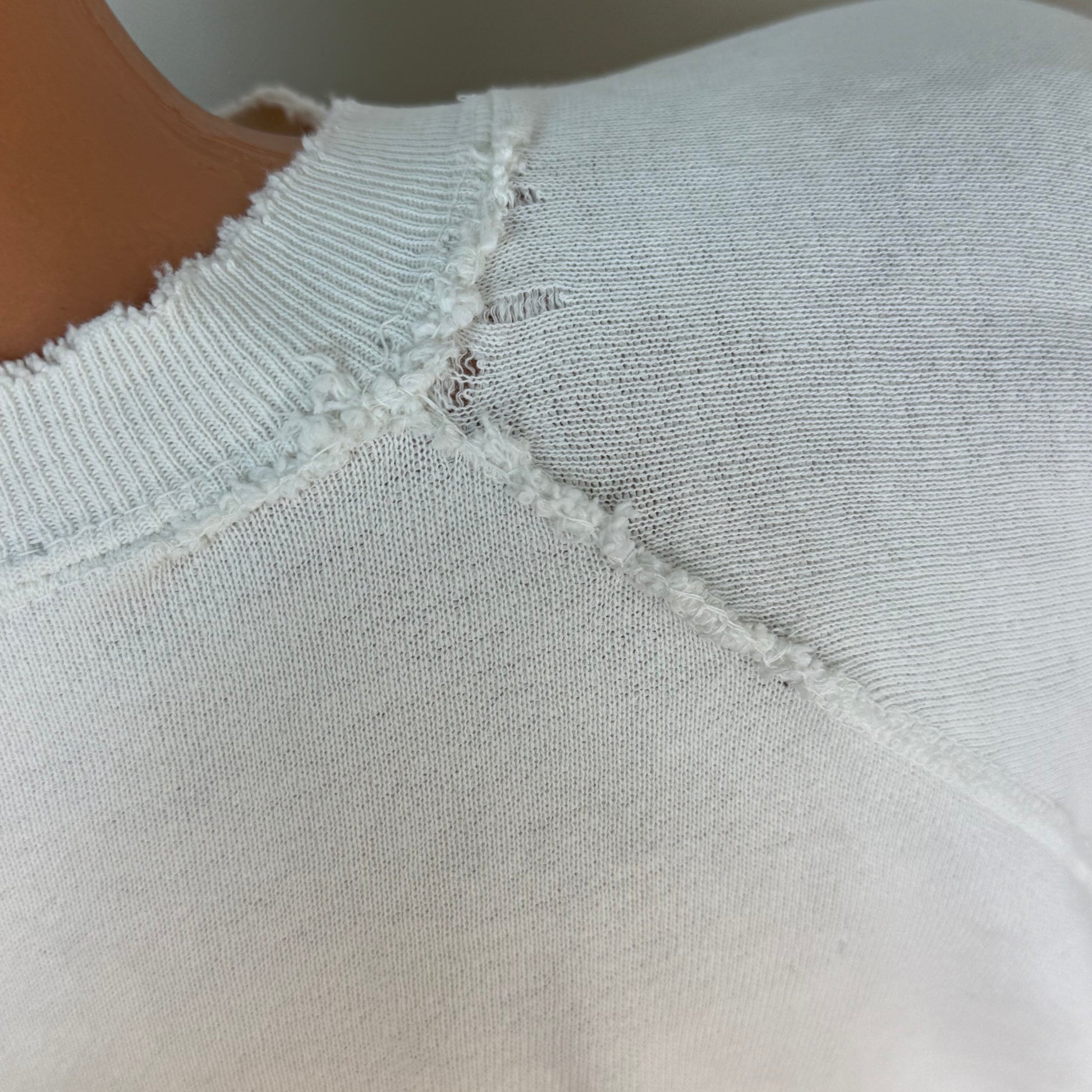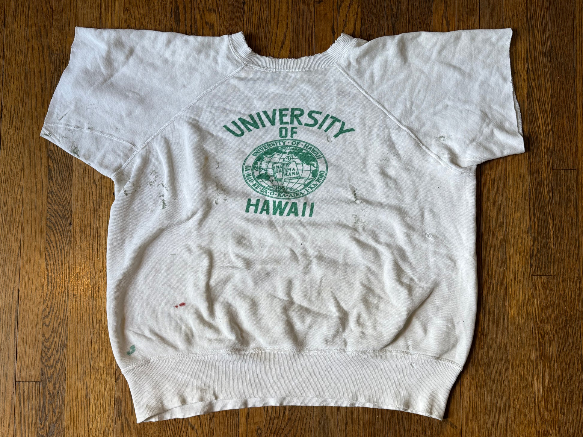 Description - University of Hawaii sweatshirt from the 60s that is quite loved. The sleeves were chopped off and have a raw edge. There are under arm gussets.