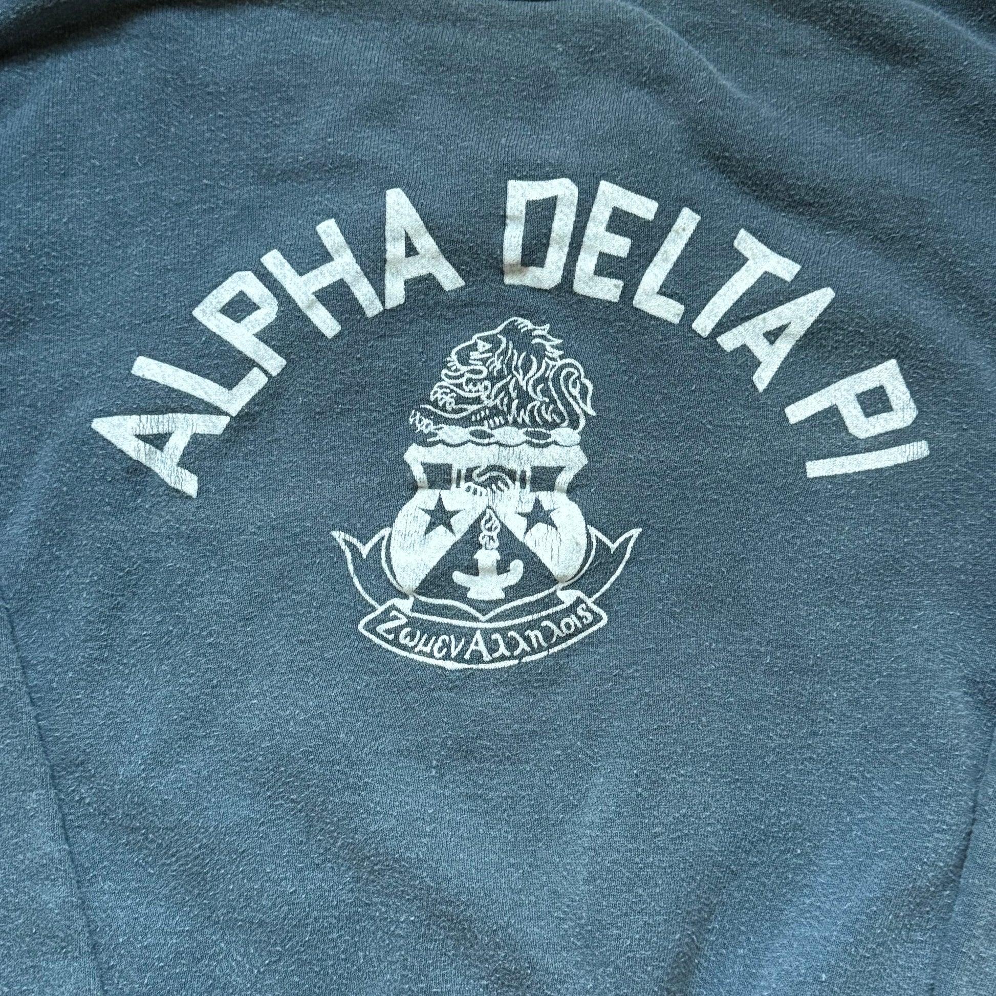 Description - Faded navy blue thick cotton sweatshirt from the 50s with an Alpha Delta Pi sorority graphic.