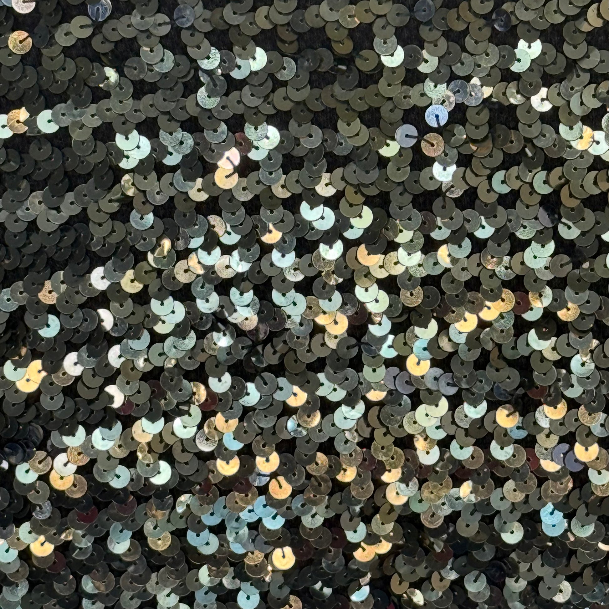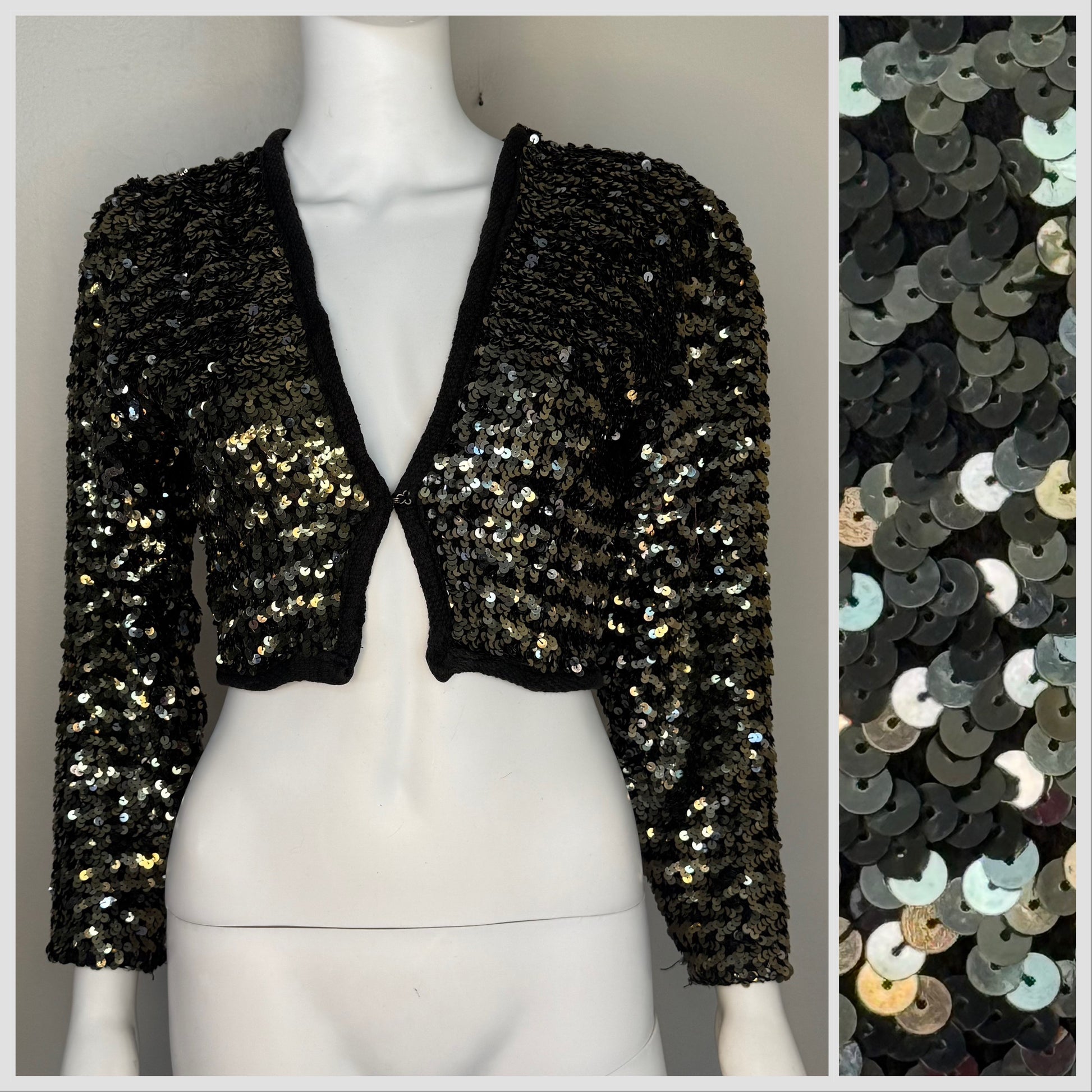 Description - Fully sequined cardigan sweater that I believe is from the 50s or 60s. It has a low v neck and secures with one hook and eye. The knitwear is black but the color of the sequins is kind of hard to describe. As you can see in the photos they sort of change based on how the light is shining on them. Sometimes they look black and sometimes they look golden and sometimes they look silverish.