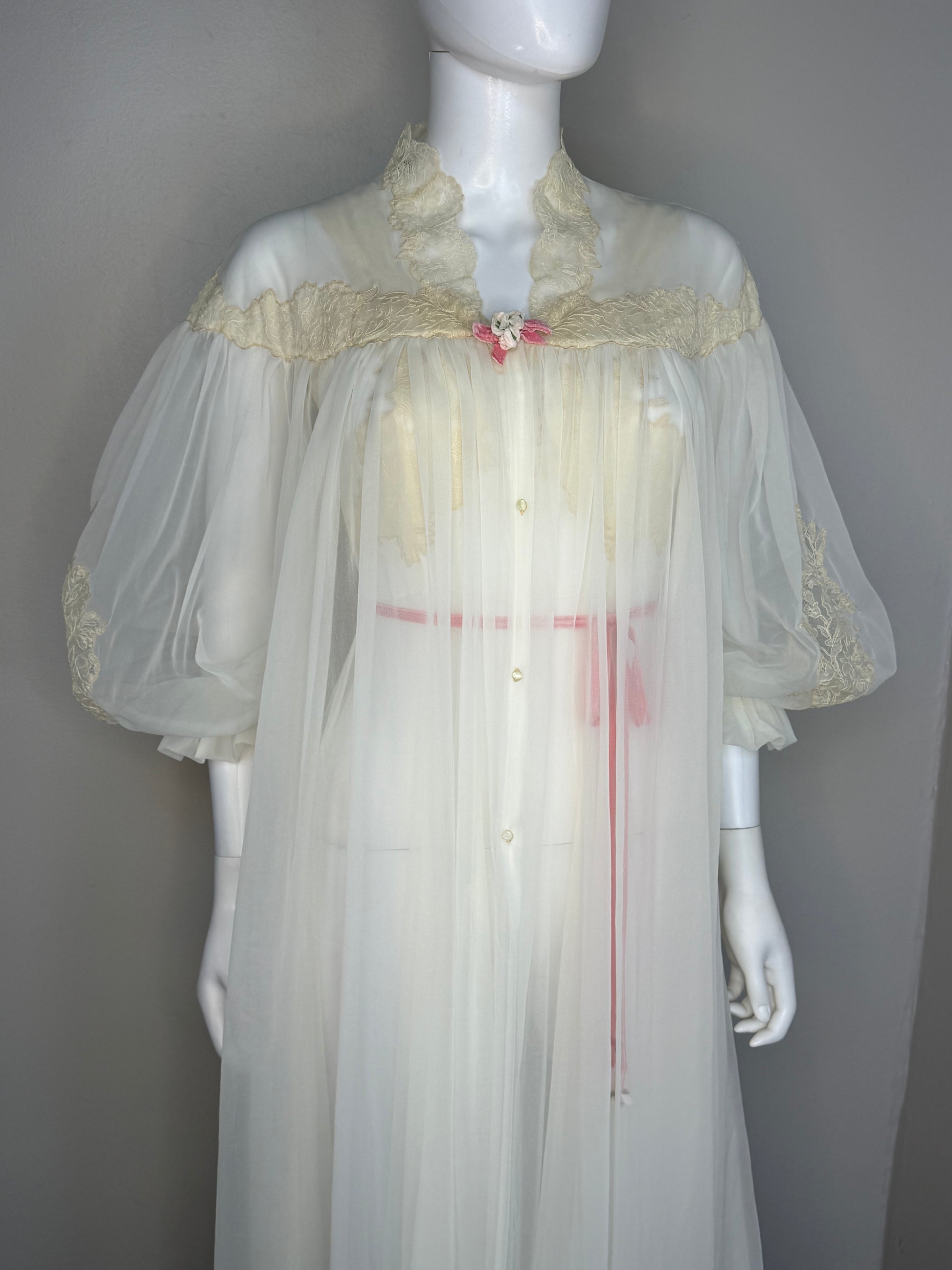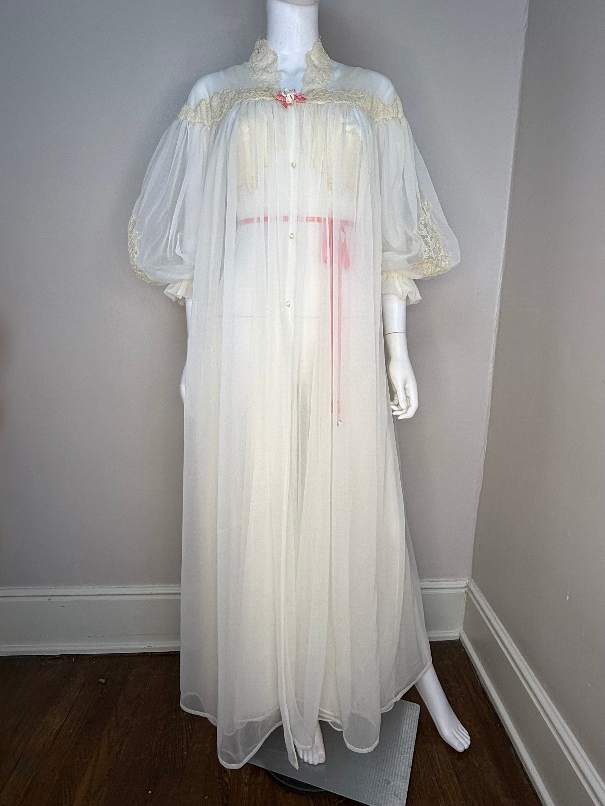 Description - Glamorous full length sheer slightly off white nylon and cream lace peignoir set from the 50s that includes a night gown and robe. The nightgown has a fitted bodice and a full sweep skirt. There is an attached pink velvet belt. The matching robe secures with 4 tiny buttons and has large balloon sleeves that have elastic at the cuff. Over the top button there is a floret with the same pink velvet ribbon.