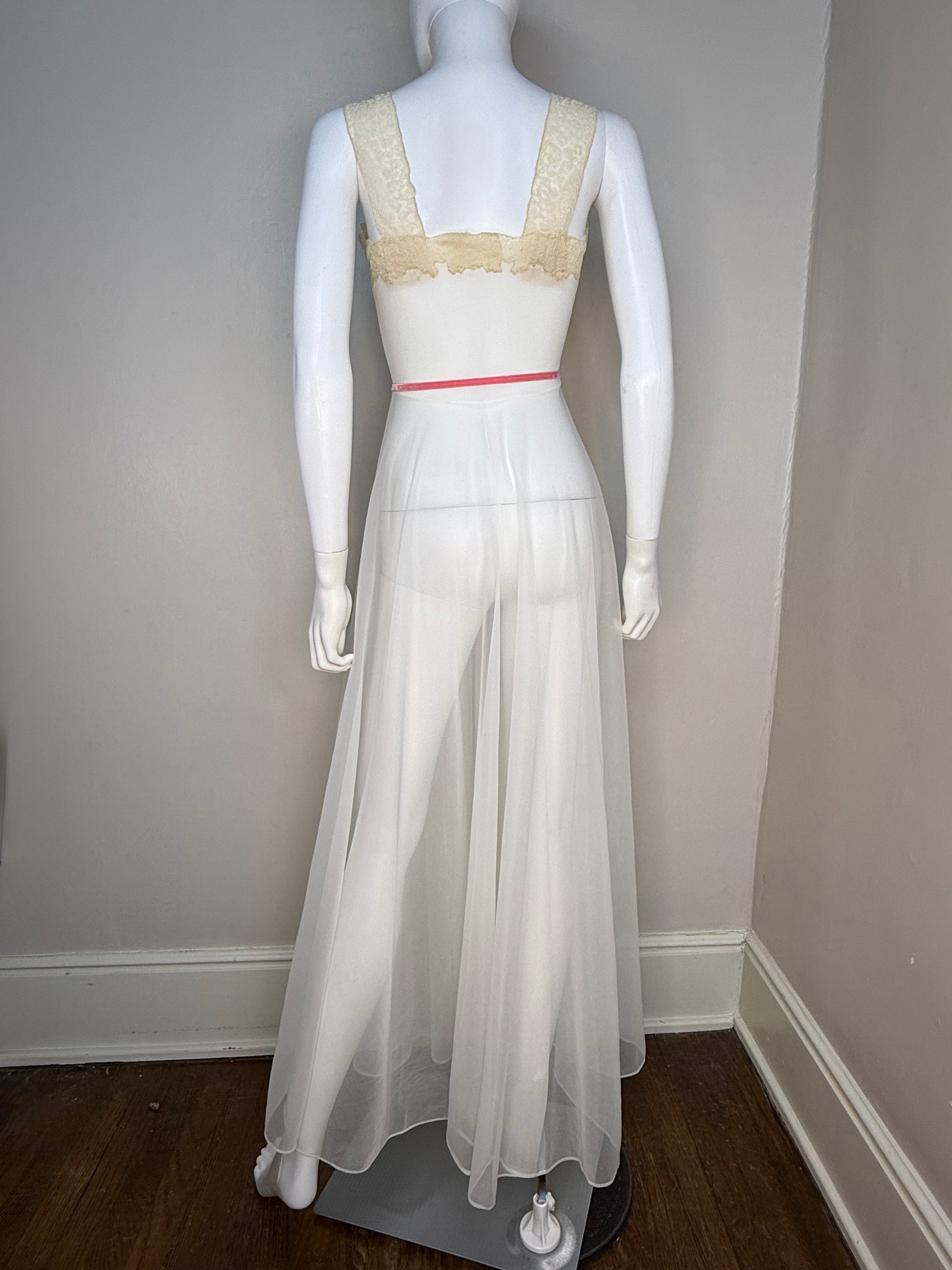 1950s Full Length Peignoir Set with Full Sweep, Sheer Off White Nylon with Cream Lace and Pink Ribbon, Yolande Size 32, XS, Night Gown and Robe, Bridal Lingerie
