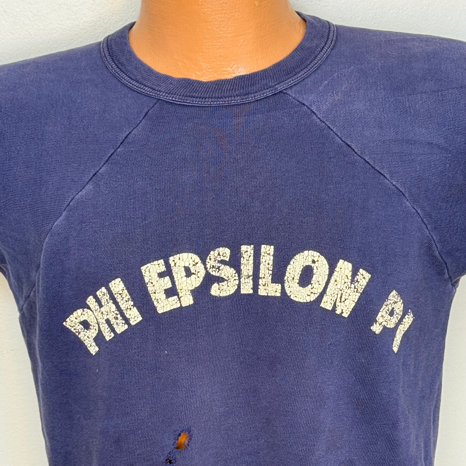 Description - Thick cotton navy blue Phi Epsilon Pi sweatshirt from the 50s or 60s. It has chopped off sleeves