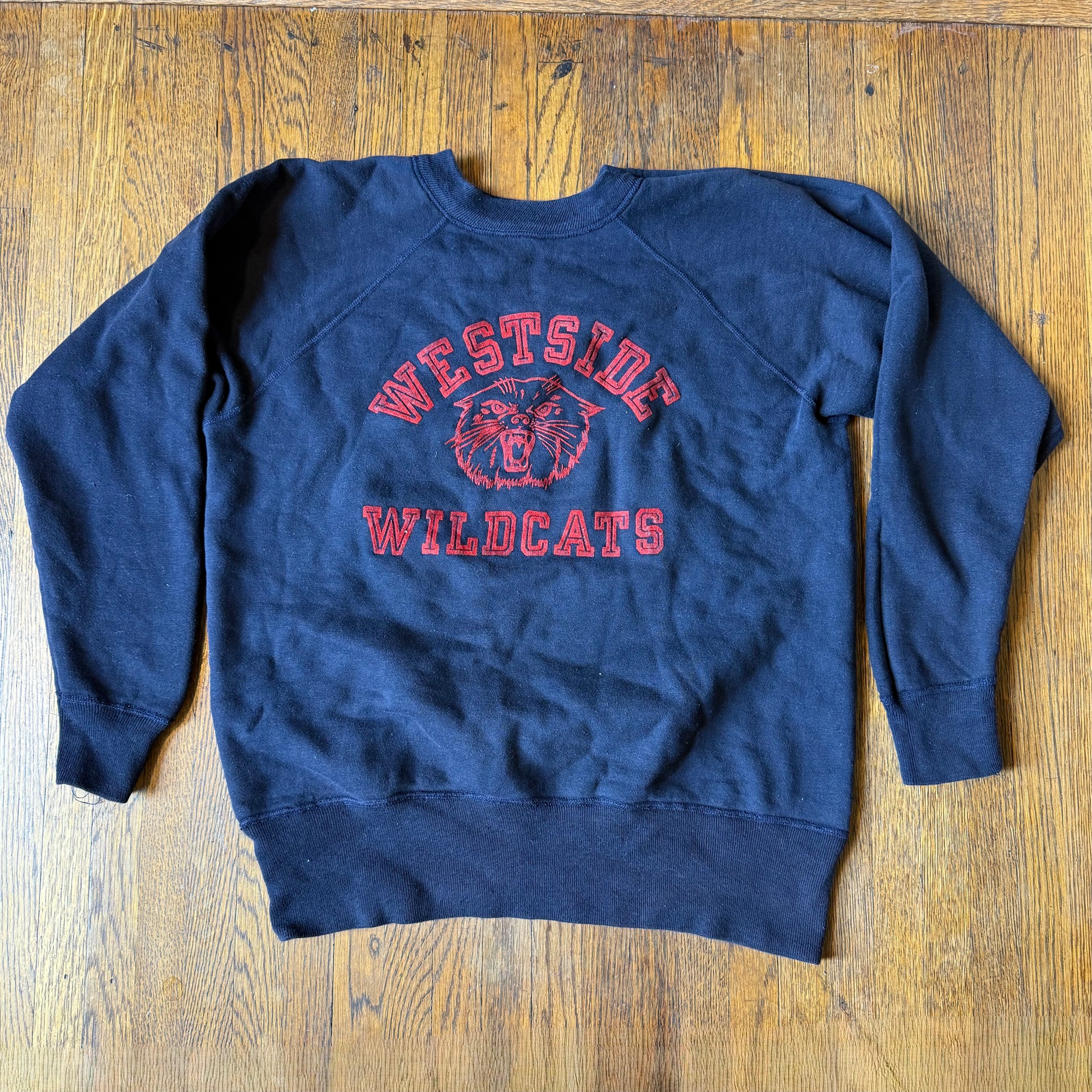 Description - Very cool navy blue Westside Wildcats crewneck sweatshirt from the 50s with a red flocked print of a cat roaring. It has raglan sleeves and is on the thicker side.