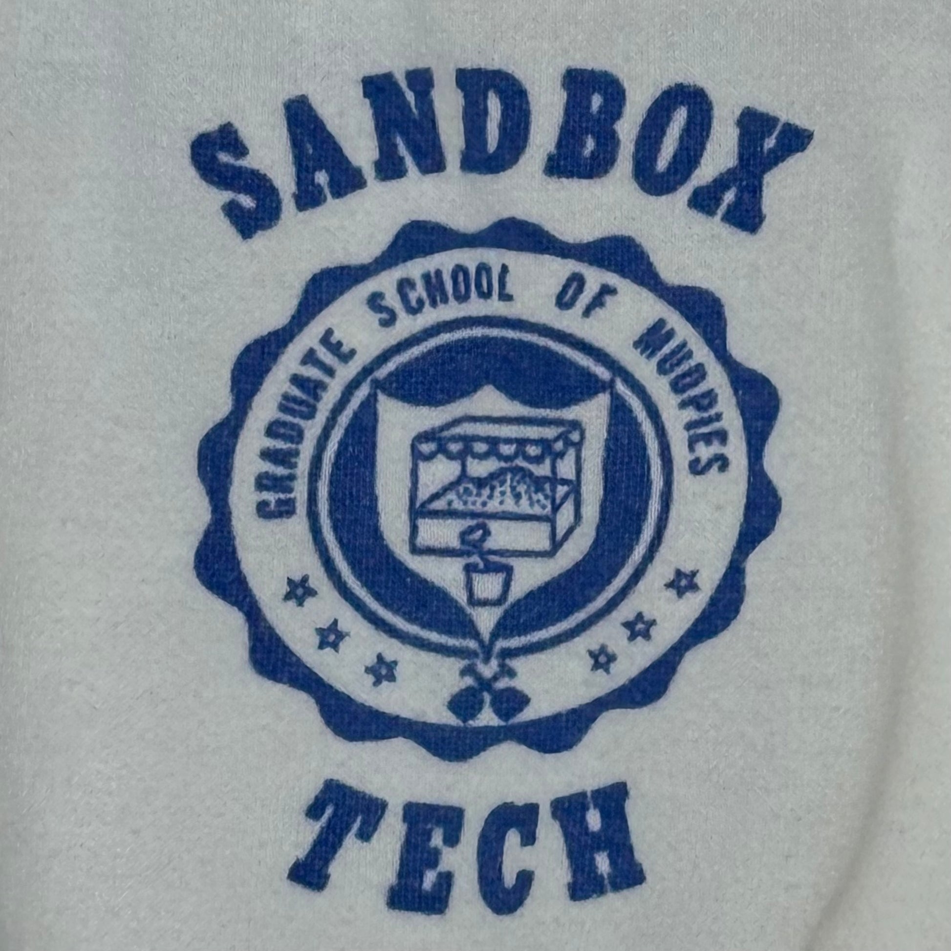 Description - Adorable toddler sweatshirt from the 60s or 70s with a university inspired graphic that says SANDBOX TECH - Graduate School of Mudpies.