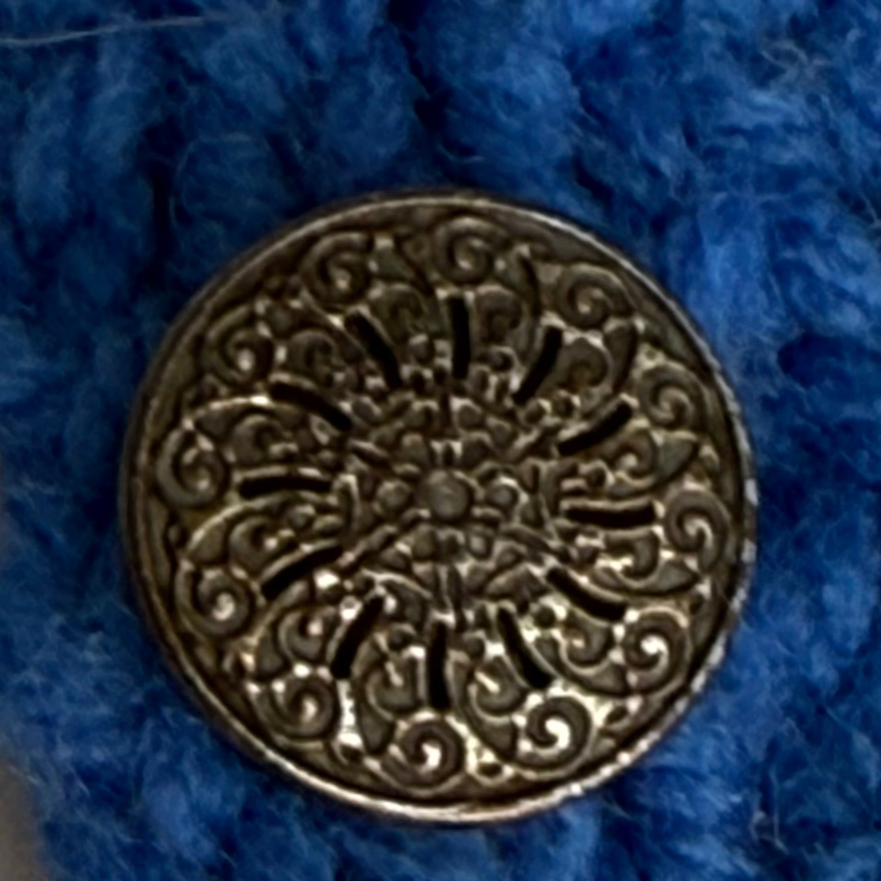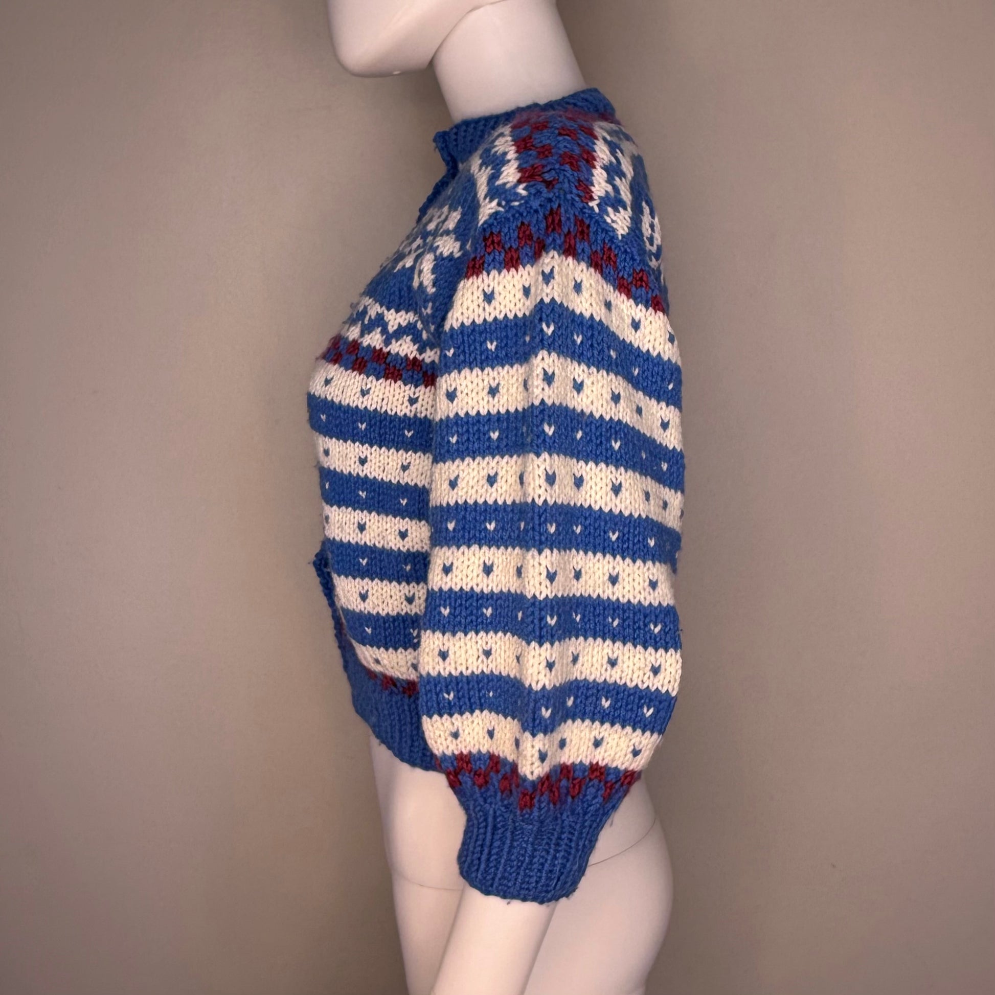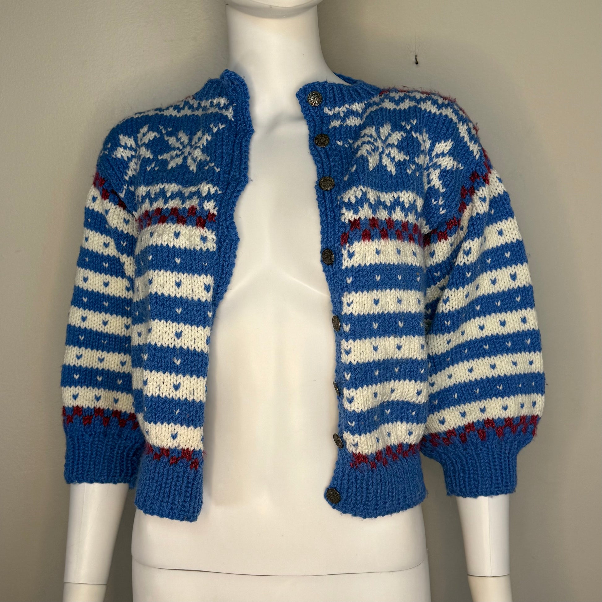 Description - Blue and white Norwegian style snowflake cardigan sweater that I believe is from the 60s or 70s (based on the items I purchased with it at an estate sale) but it's hard to know for sure because it was hand knit. It could be a bit older or newer. It has cool old pewter buttons. The sleeves are 3/4 length and have a slight balloon shape.