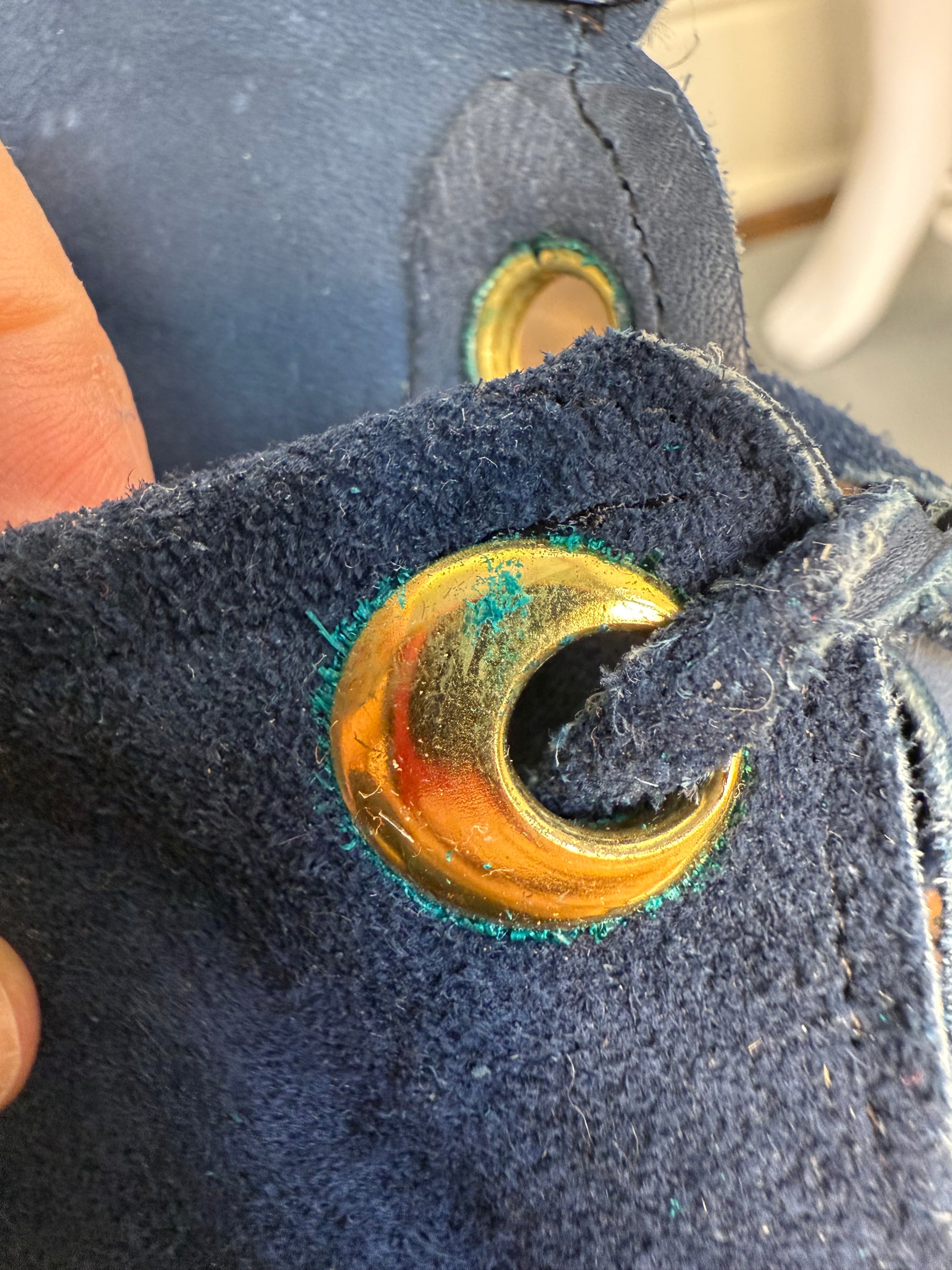 Description - Blue leather go go boots from the late 60s or early 70s. They zip up the inside of the leg and there are laces up the outside The upper part is soft and does not have anything stiff holding them up. You can adjust the laces to fit your calf.