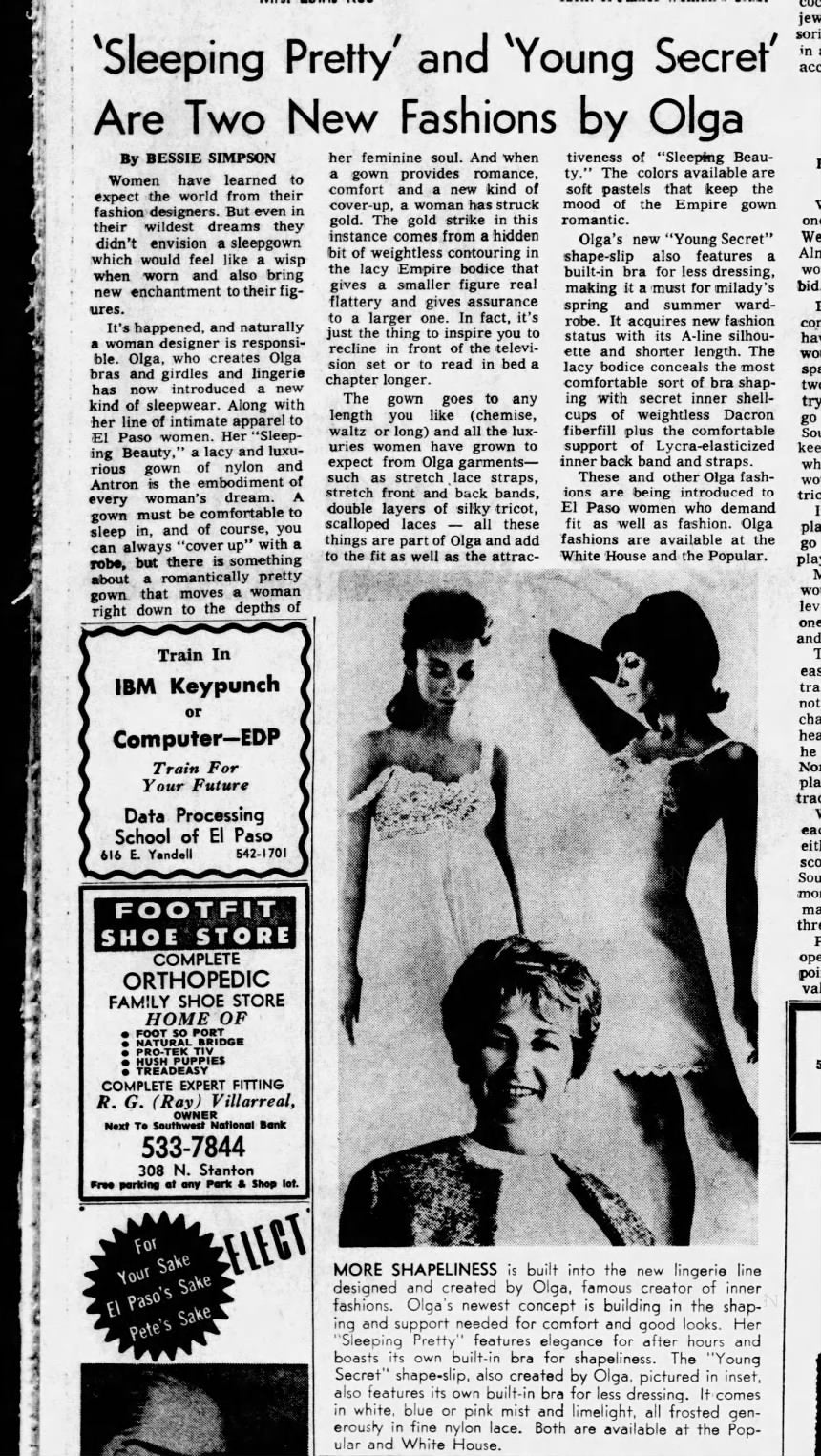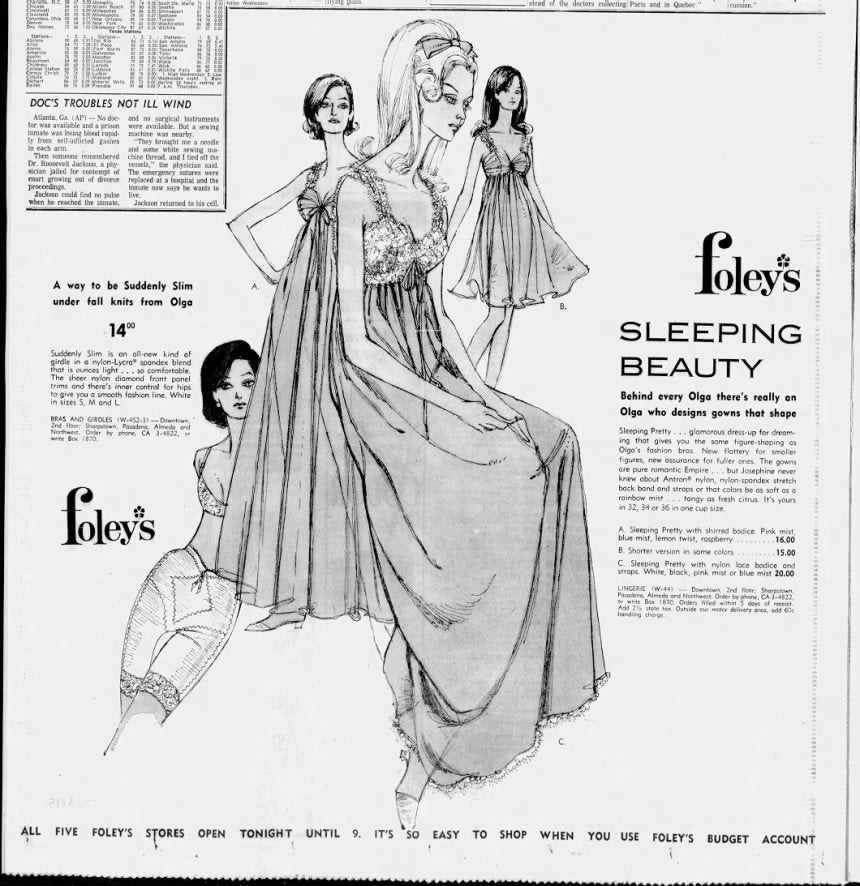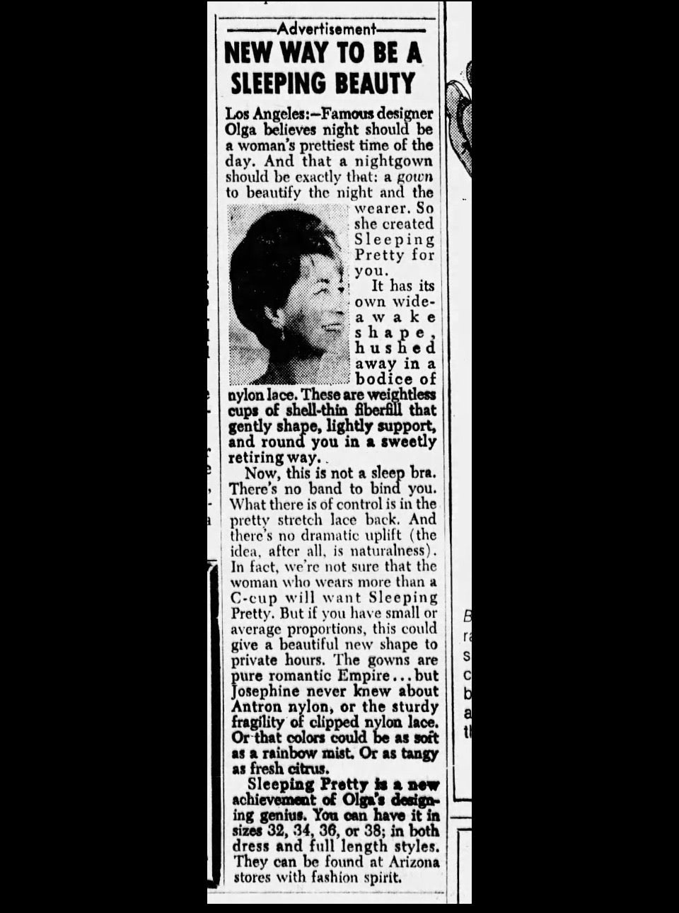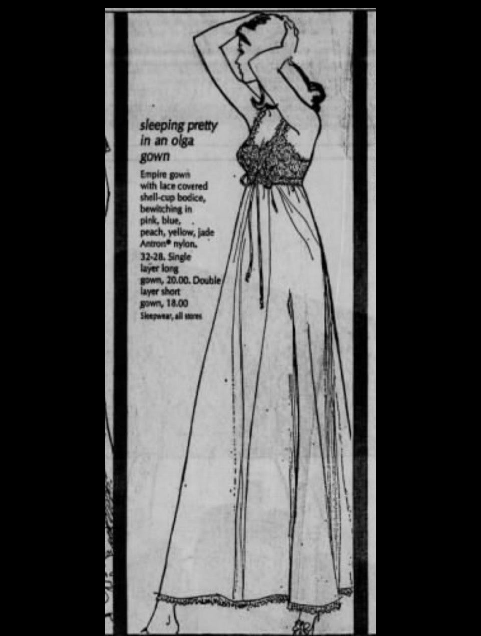 Here's a description I found from when this style was first put into production in the 1960s: Famous designer Olga believes night should be a woman's prettiest time of the day. And that a nightgown should be exactly that: a gown to beautify the night and the wearer. So she created Sleeping Pretty for you. It has its own wide-a wake shape hushed away in a bodice of nylon lace. These are weightless cups of shell-thin fiberfill that gently shape, lightly support, and round you in a sweetly retiring way. Now, this is not a sleep bra. There's no band to bind you. What there is of control is in the pretty stretch lace back. And there's no dramatic uplift (the idea, after all, is naturalness) In fact, we're not sure that the woman who wears more than a C-cup will want Sleeping Pretty. But if you have small or average proportions, this could give a beautiful new shape to private hours. The gowns are pure romantic Empire... but Josephine never knew about Antron nylon, or the sturdy fragility of clipped nylon lace. Or that colors could be as soft as a rainbow mist. Or as tangy as fresh citrus. Sleeping Pretty is a new achievement of Olga's designing genius. You can have it in sizes 32, 34, 36, or 38; in both dress and full length styles.