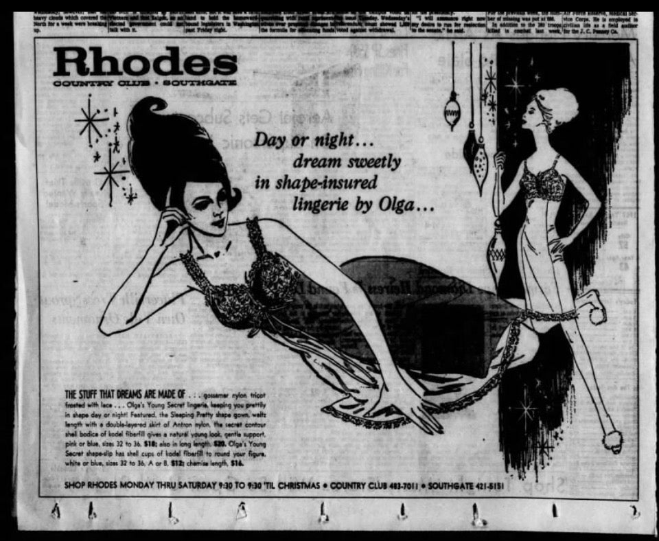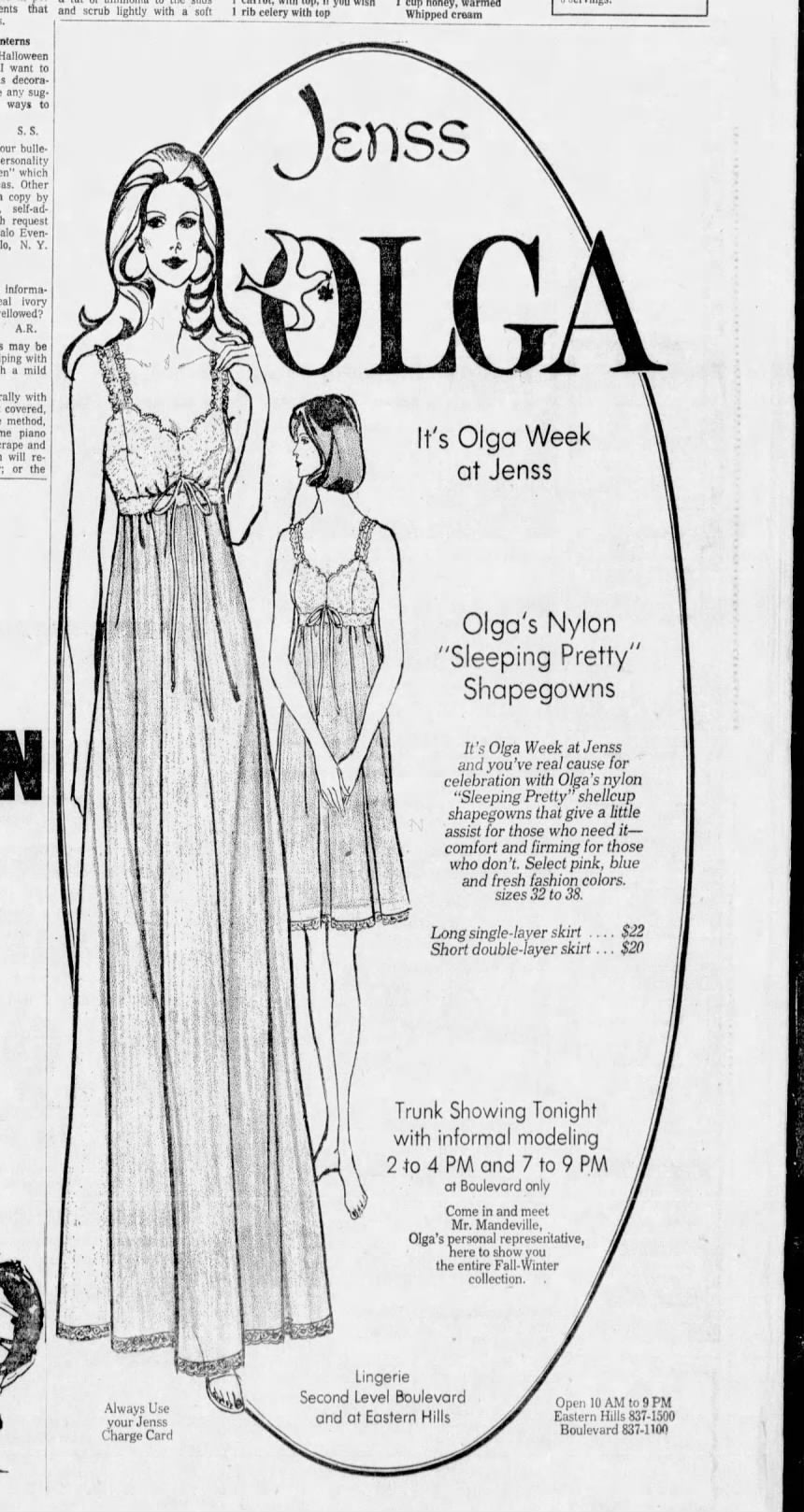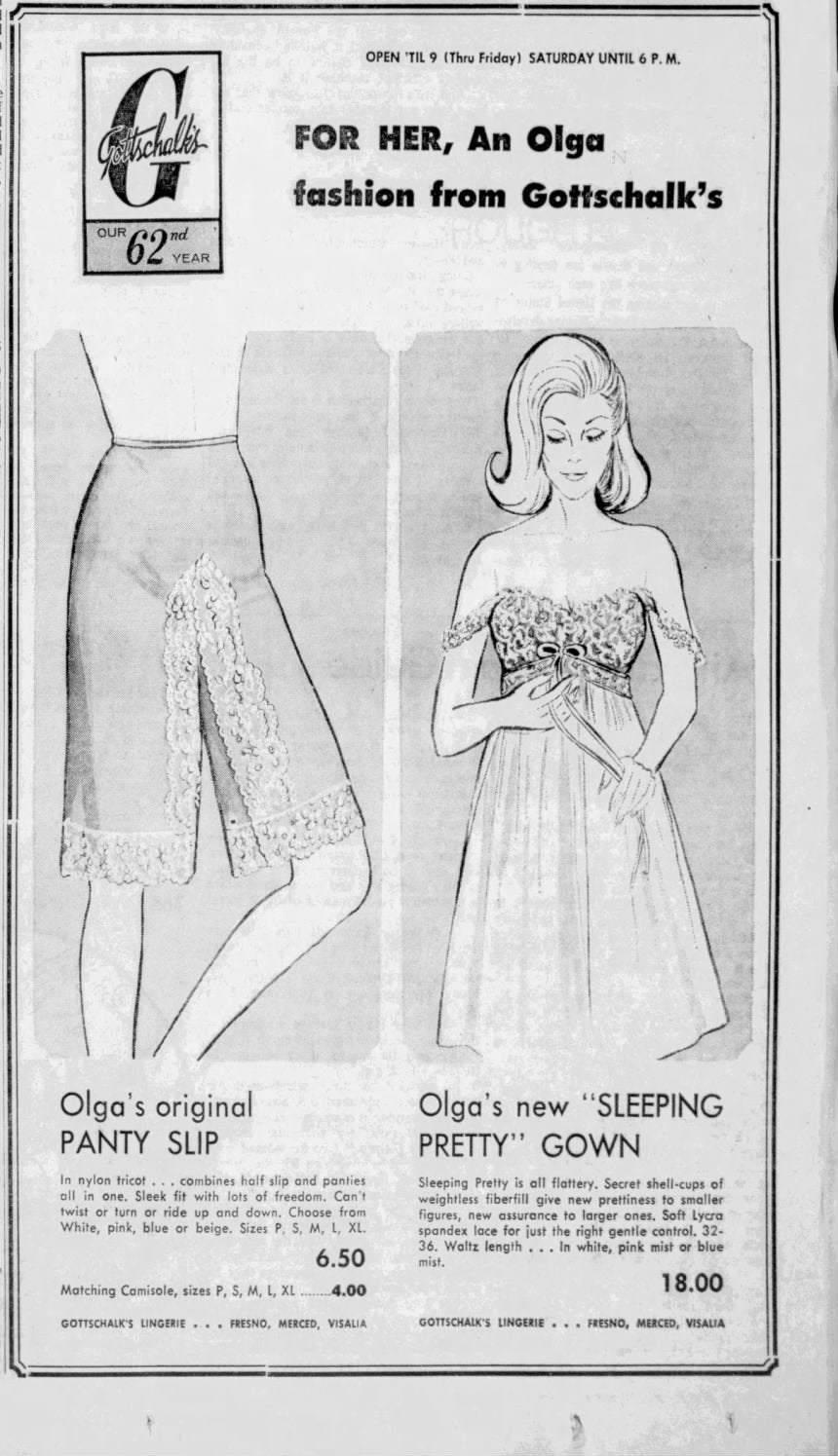 Here's a description I found from when this style was first put into production in the 1960s: Famous designer Olga believes night should be a woman's prettiest time of the day. And that a nightgown should be exactly that: a gown to beautify the night and the wearer. So she created Sleeping Pretty for you. It has its own wide-a wake shape hushed away in a bodice of nylon lace. These are weightless cups of shell-thin fiberfill that gently shape, lightly support, and round you in a sweetly retiring way. Now, this is not a sleep bra. There's no band to bind you. What there is of control is in the pretty stretch lace back. And there's no dramatic uplift (the idea, after all, is naturalness) In fact, we're not sure that the woman who wears more than a C-cup will want Sleeping Pretty. But if you have small or average proportions, this could give a beautiful new shape to private hours. The gowns are pure romantic Empire... but Josephine never knew about Antron nylon, or the sturdy fragility of clipped nylon lace. Or that colors could be as soft as a rainbow mist. Or as tangy as fresh citrus. Sleeping Pretty is a new achievement of Olga's designing genius. You can have it in sizes 32, 34, 36, or 38; in both dress and full length styles.
