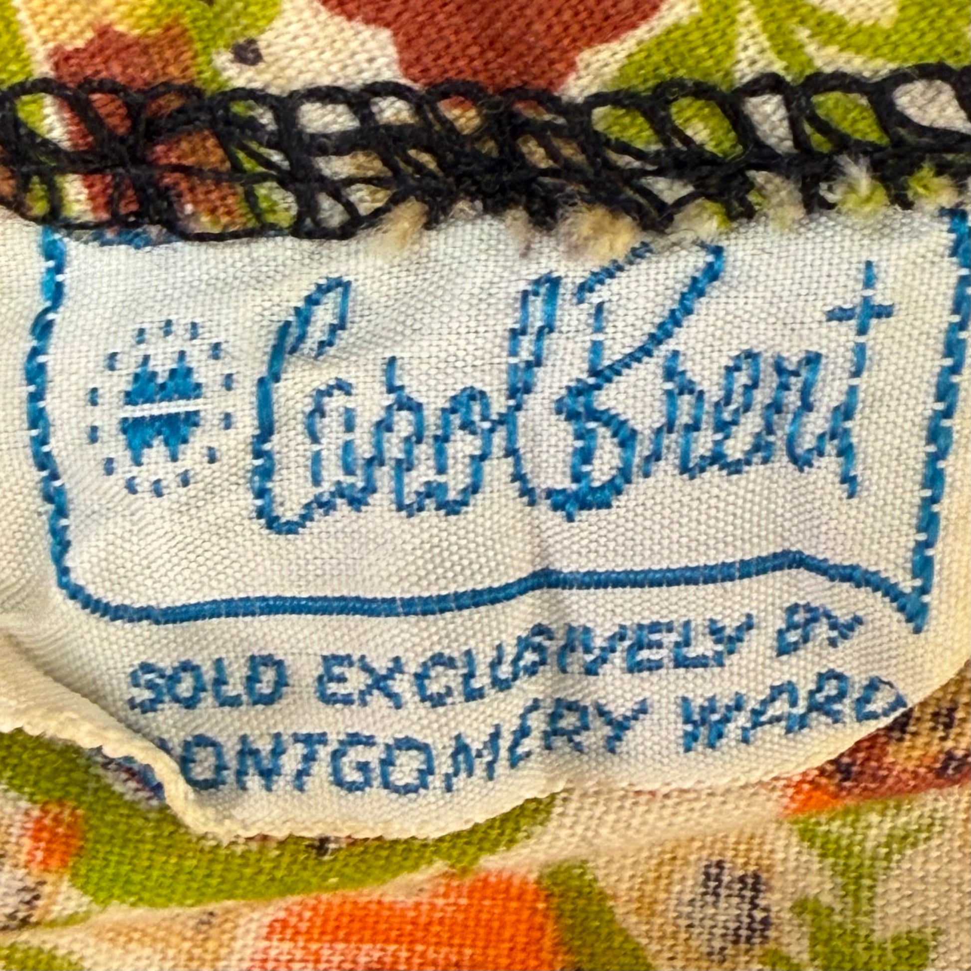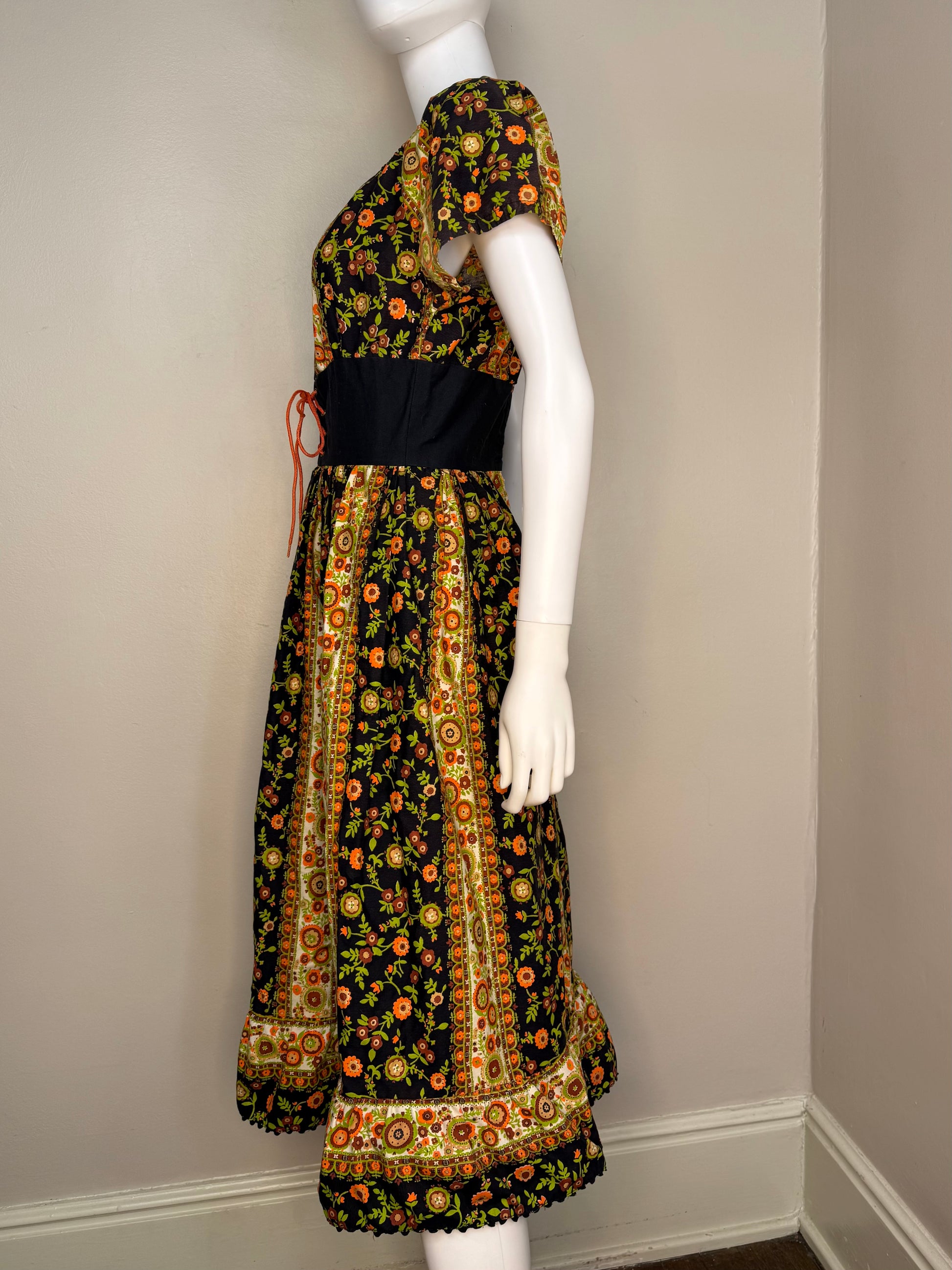 1960s Black and Orange Floral Peasant Dress with Corset Waist, Carol Brent Size Small-Medium, Montgomery Ward