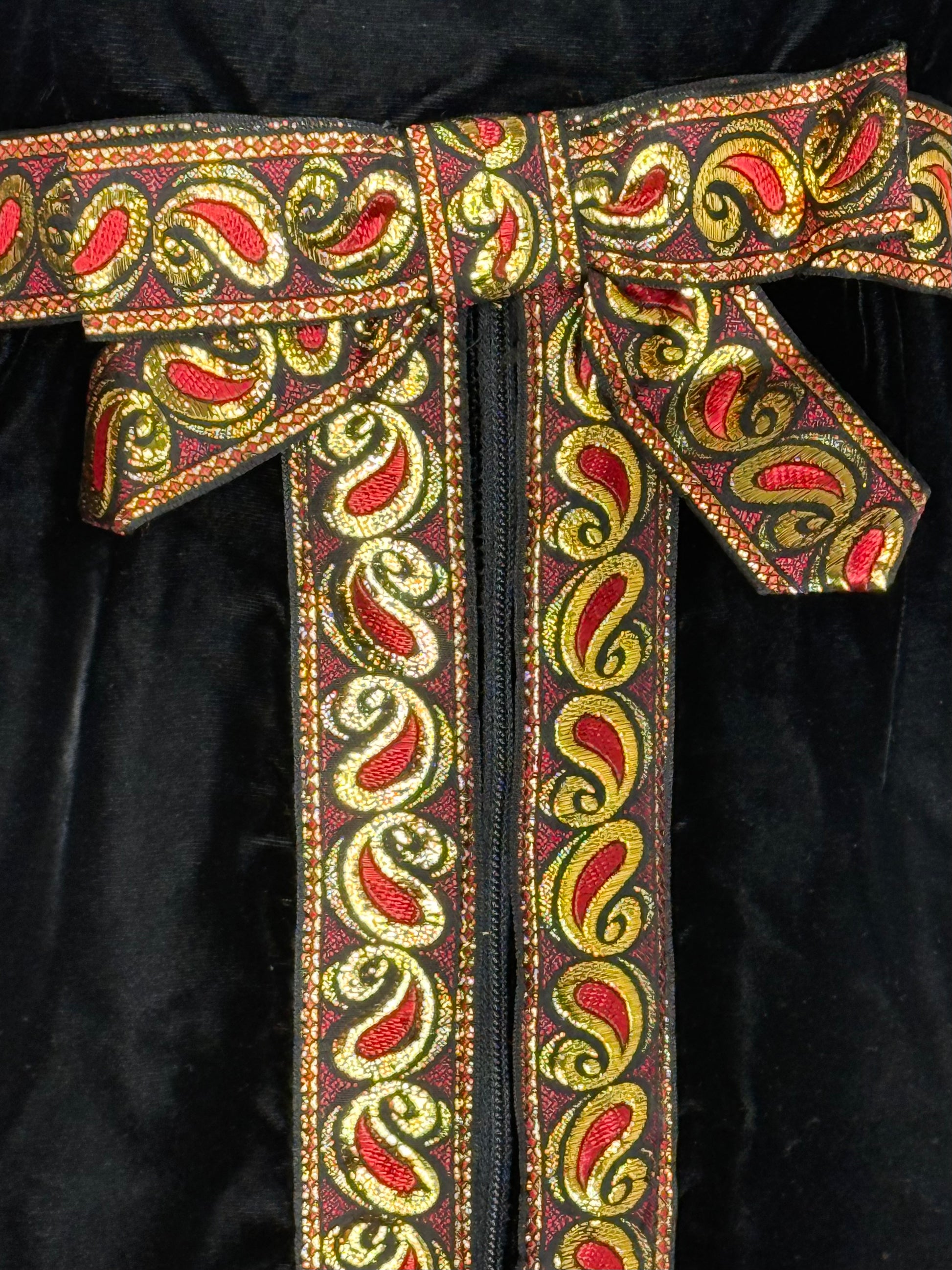 Description - Sleeveless black velvet maxi dress from the 60s with metallic gold and red ribbon trim. It zips up the back as well as between the 2 pieces of ribbon down the rront. You can unzip the front zipper up to the waist. You could wear it unzipped with shorts, bloomers, or pants underneath. I think there were probably coordinating bottoms sold by the manufacturer as well.