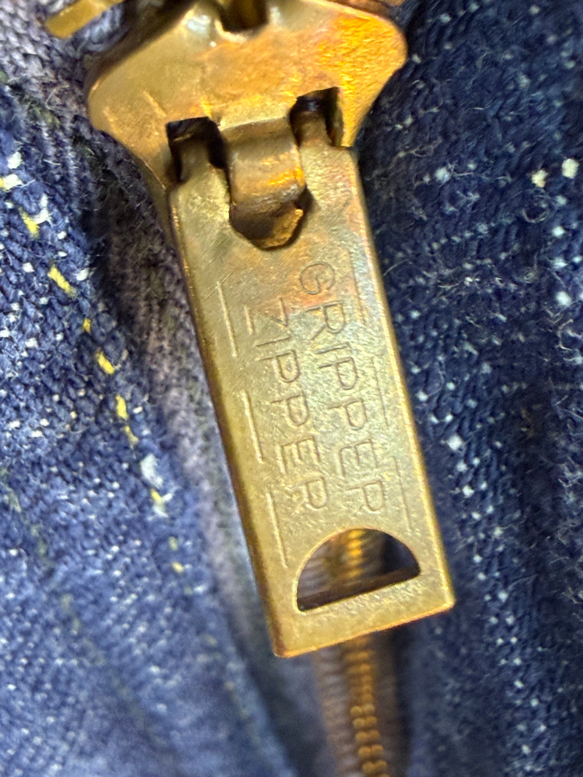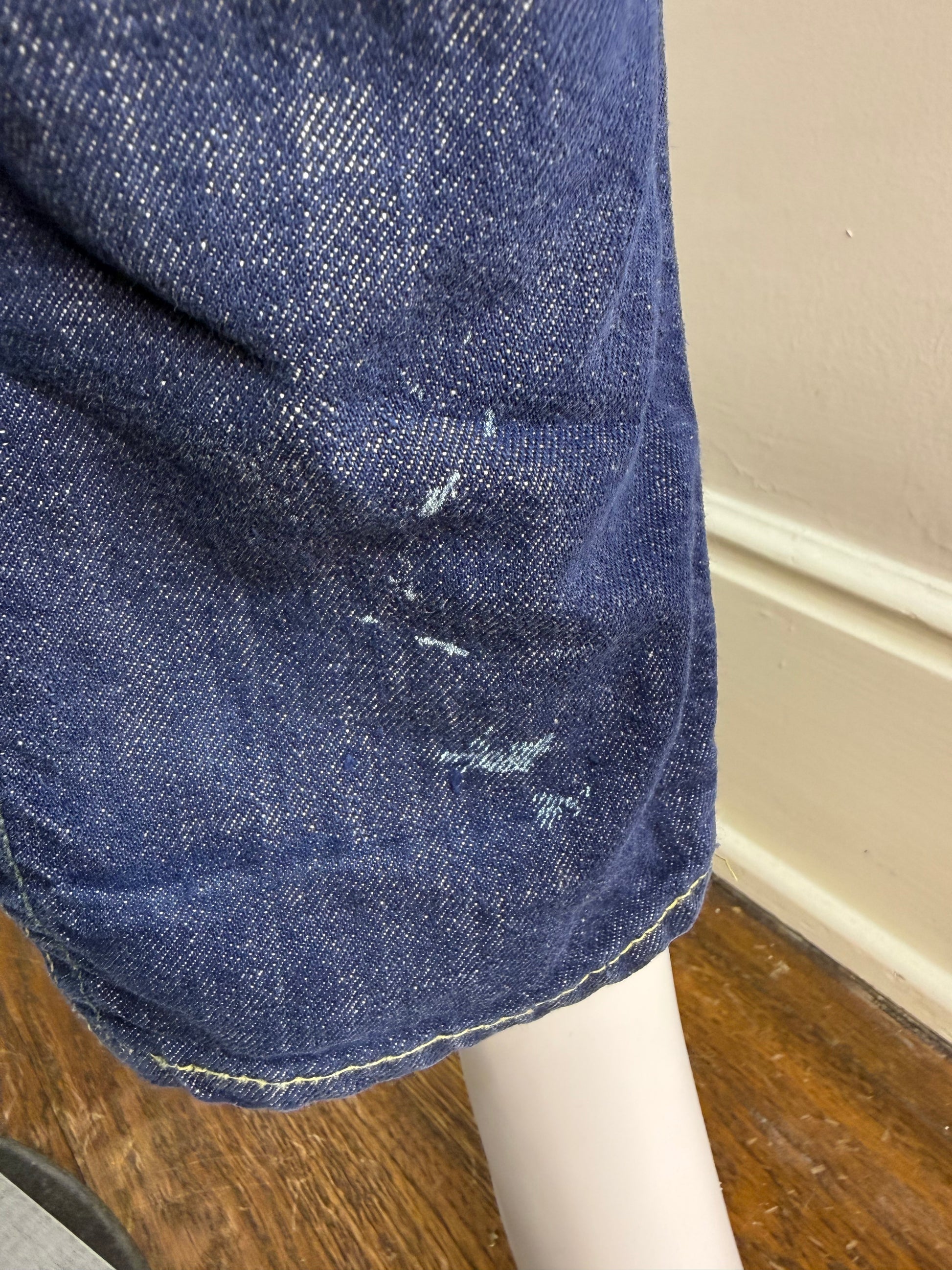 Description - High waisted dark denim tapered leg jeans from the early 60s. They have a gripper zipper.