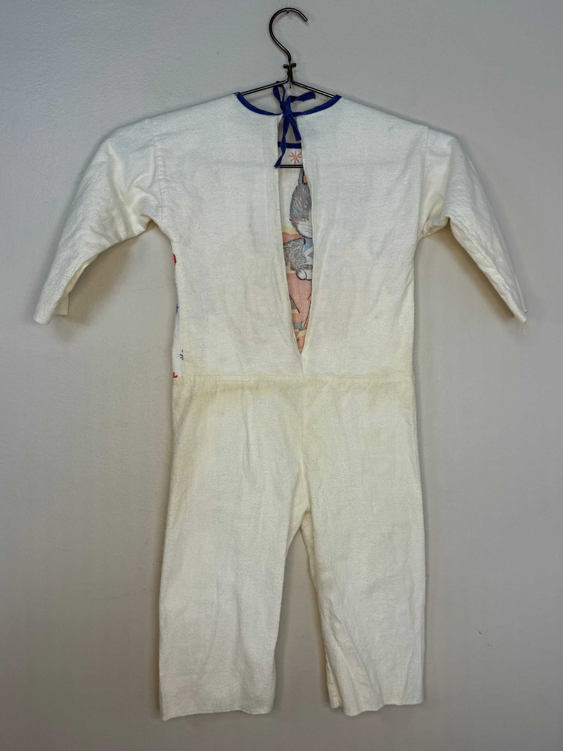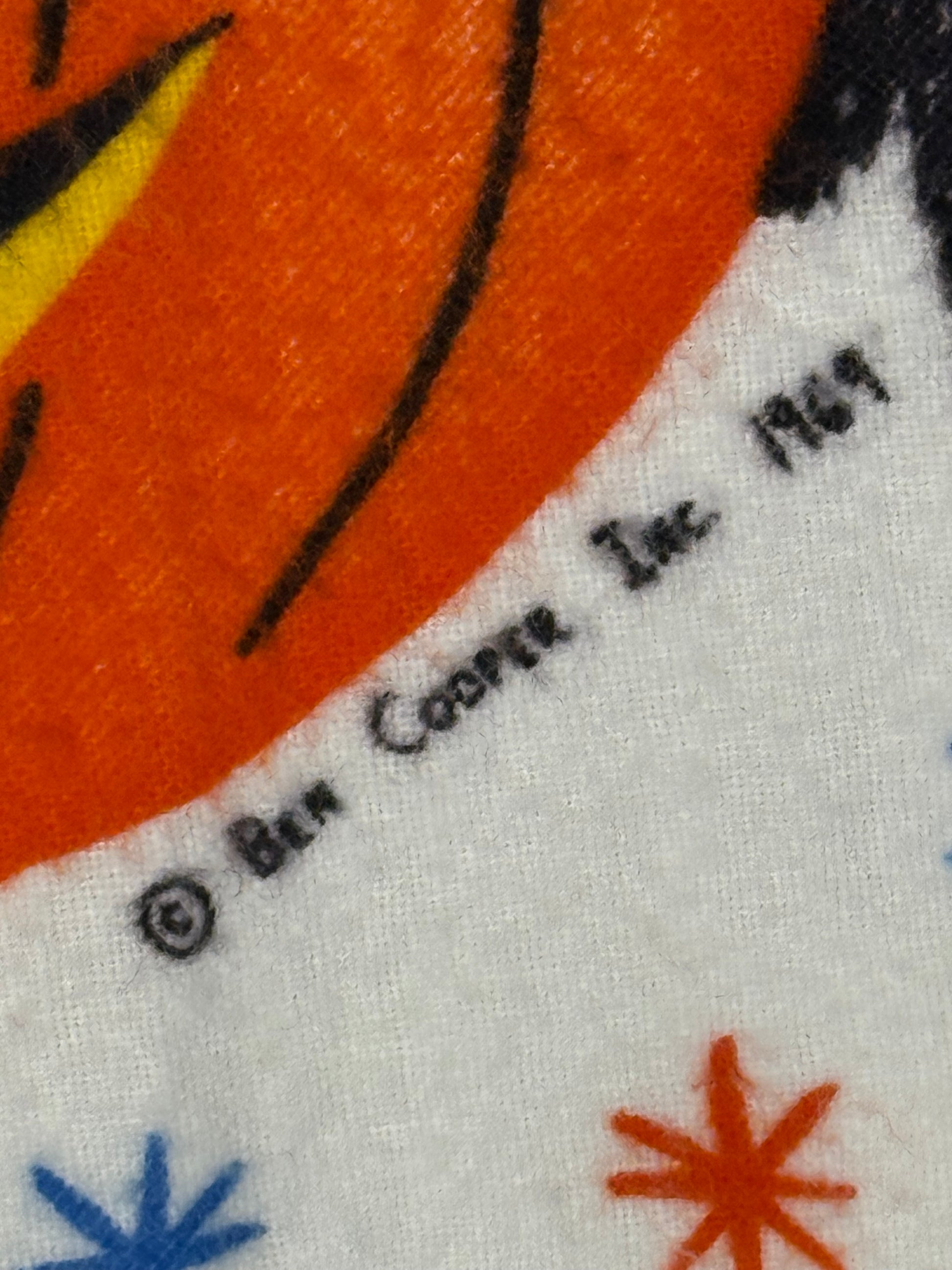 Description - Flannel one piece halloween costume dated 1969. It has an adorable graphic of a cat inside a pumpkin. It probably came with a plastic cat mask but it would be super cute to just add a cat ear headband with it to finish off the costume. It opens up in the back and closes with a tie. The fabric is really soft.