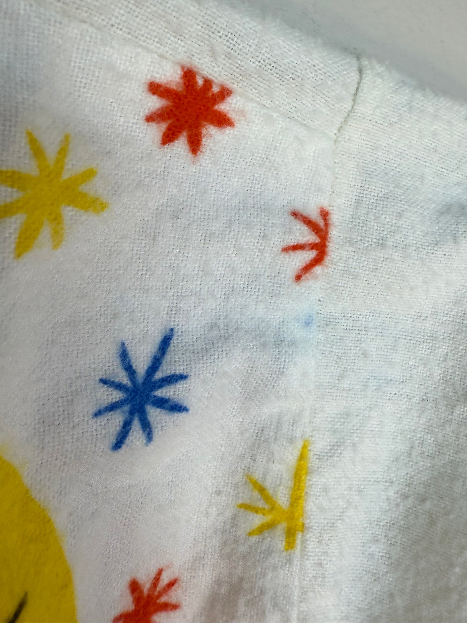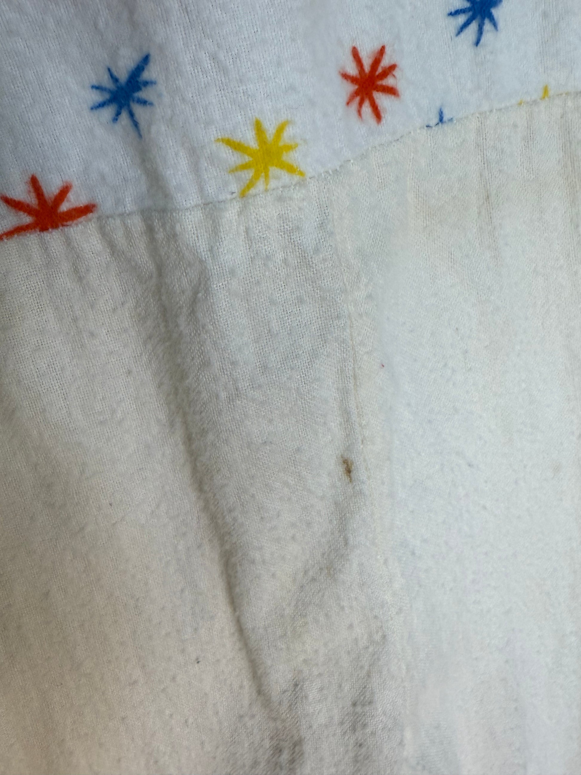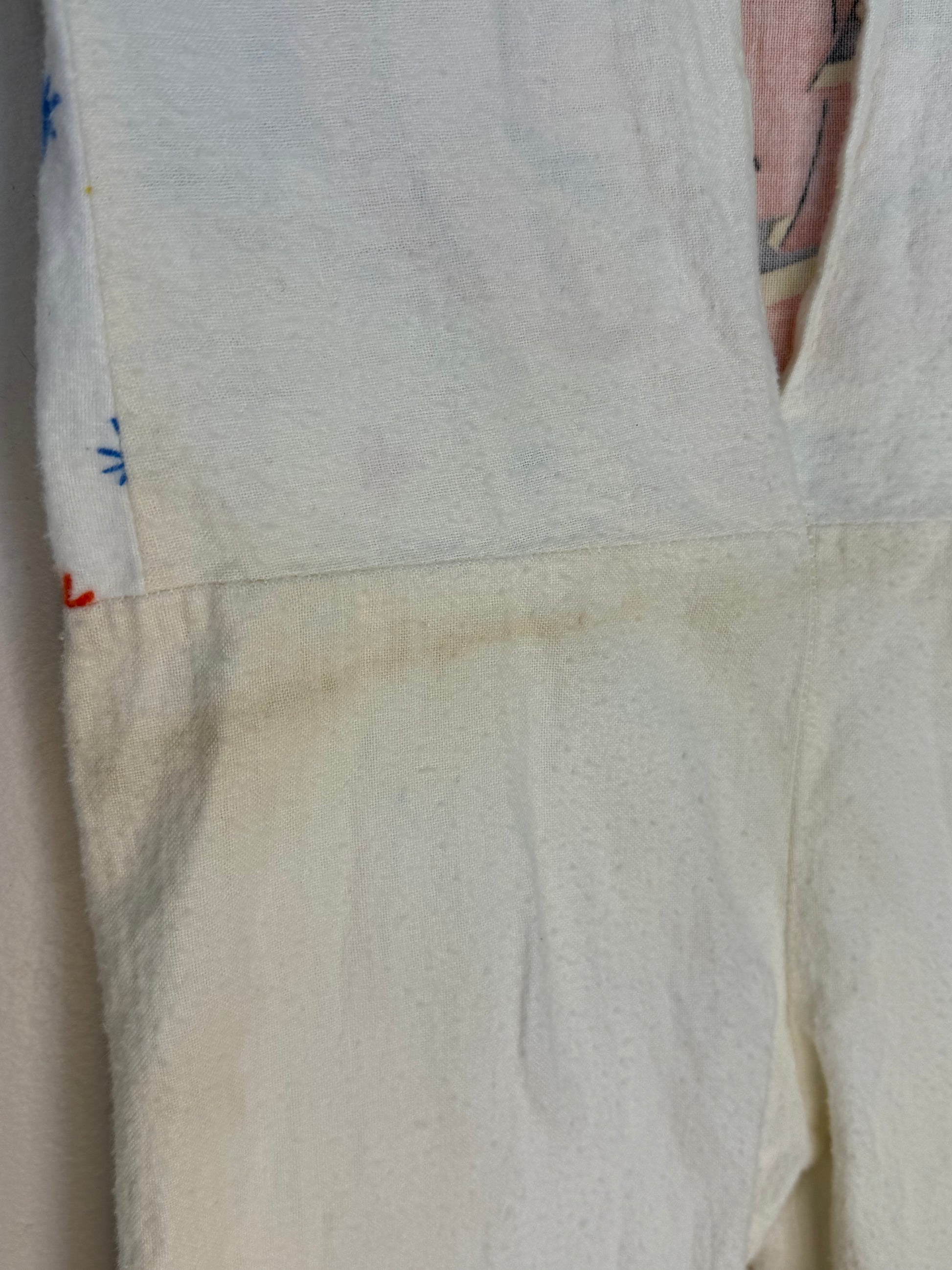 Condition - There is some discoloration on the back along the waist. I found a tiny spot on the front and there is a little bit of color bleed or some sort of blue marks in the design.