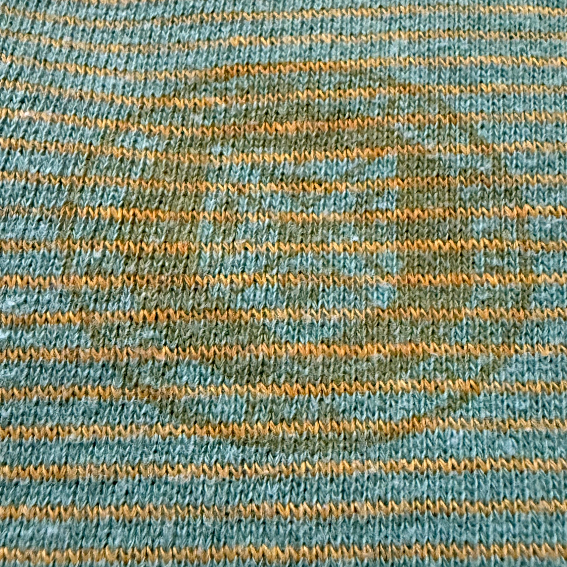 Description - Green and mustard yellow micro striped sweatshirt with mustard bands. There is a small print on the chest that I'm guessing is a university or fraternity logo but I can't make it out.