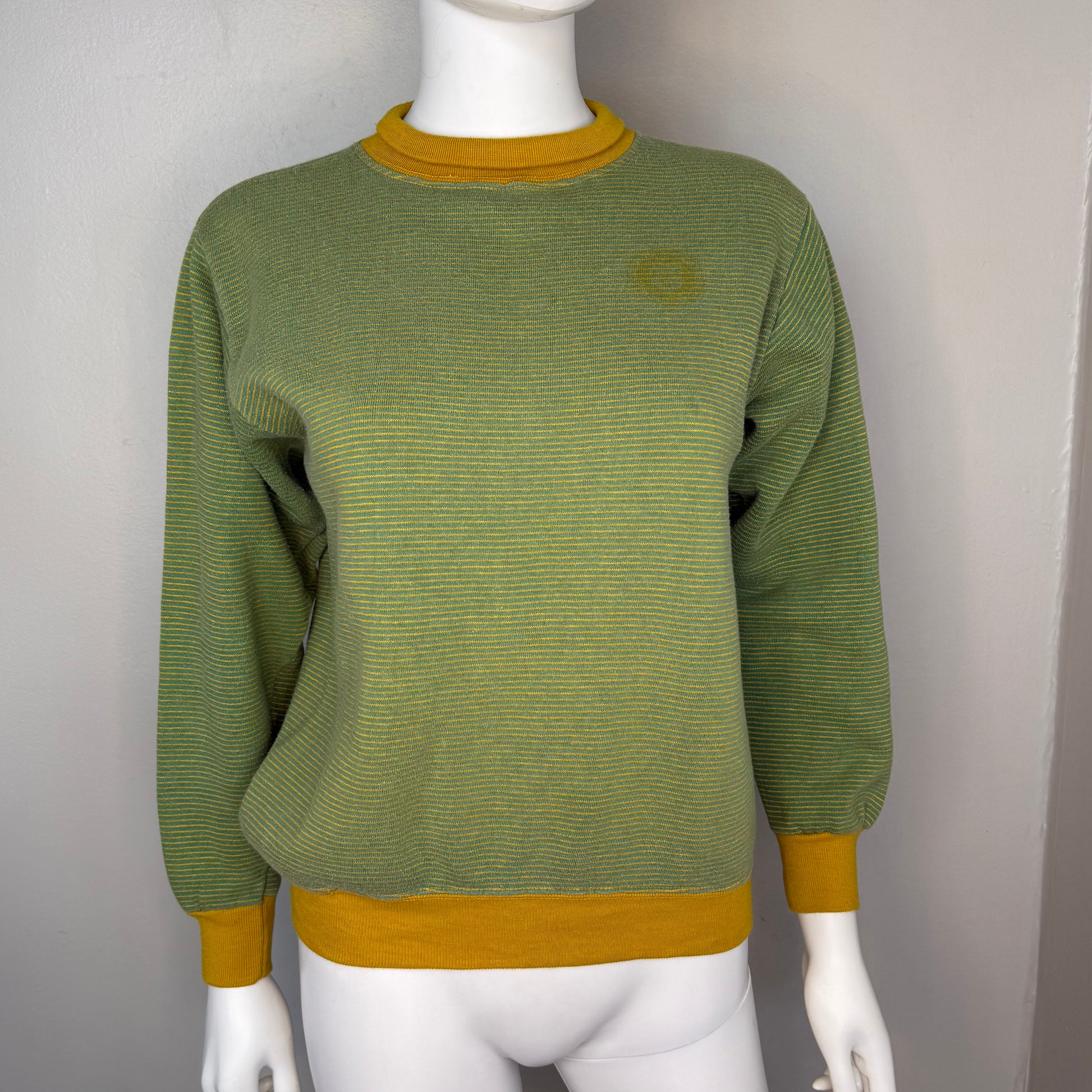 1960s Green and Yellow Micro Stripe Sweatshirt, Champion Size Medium, Running Man Tag, Mock Neck