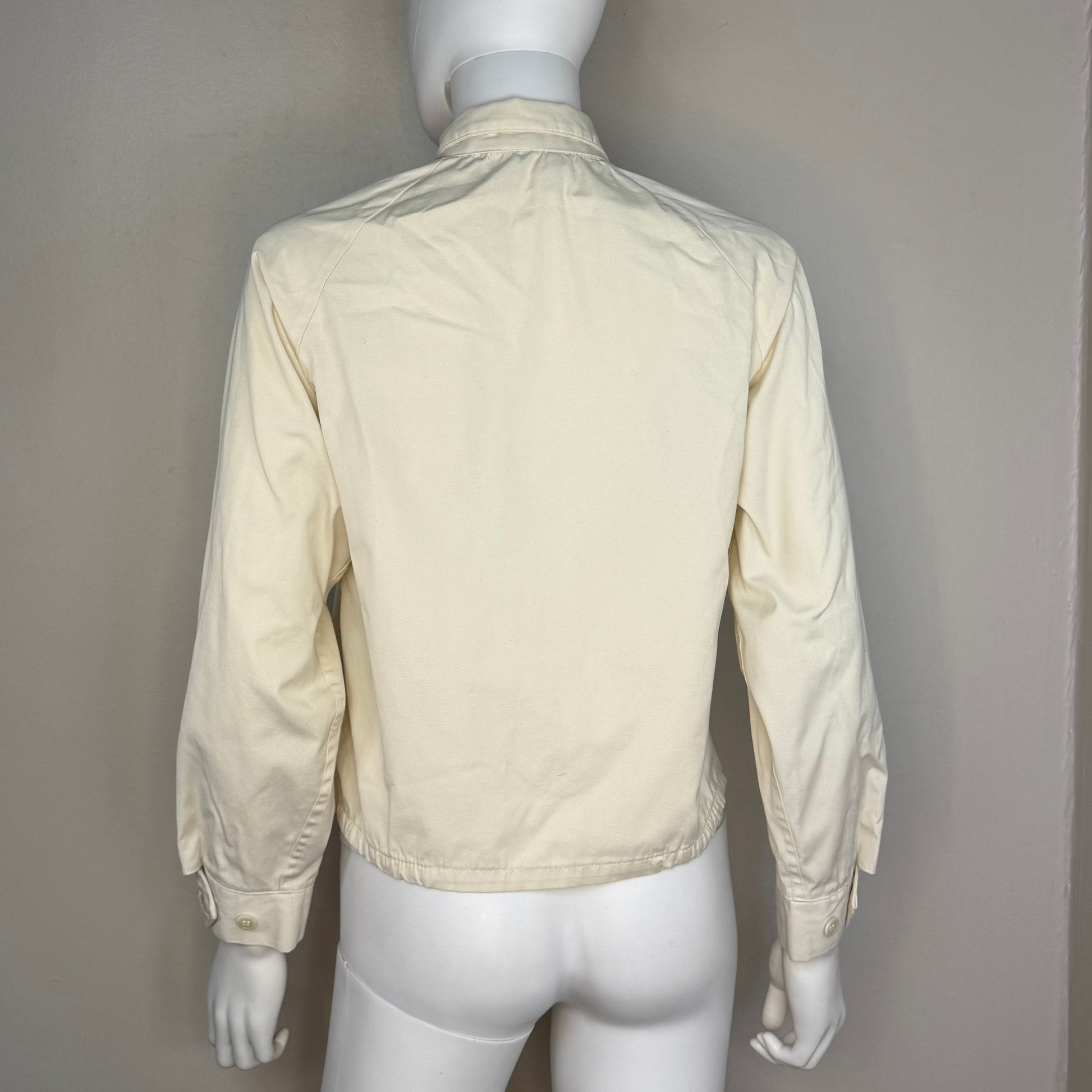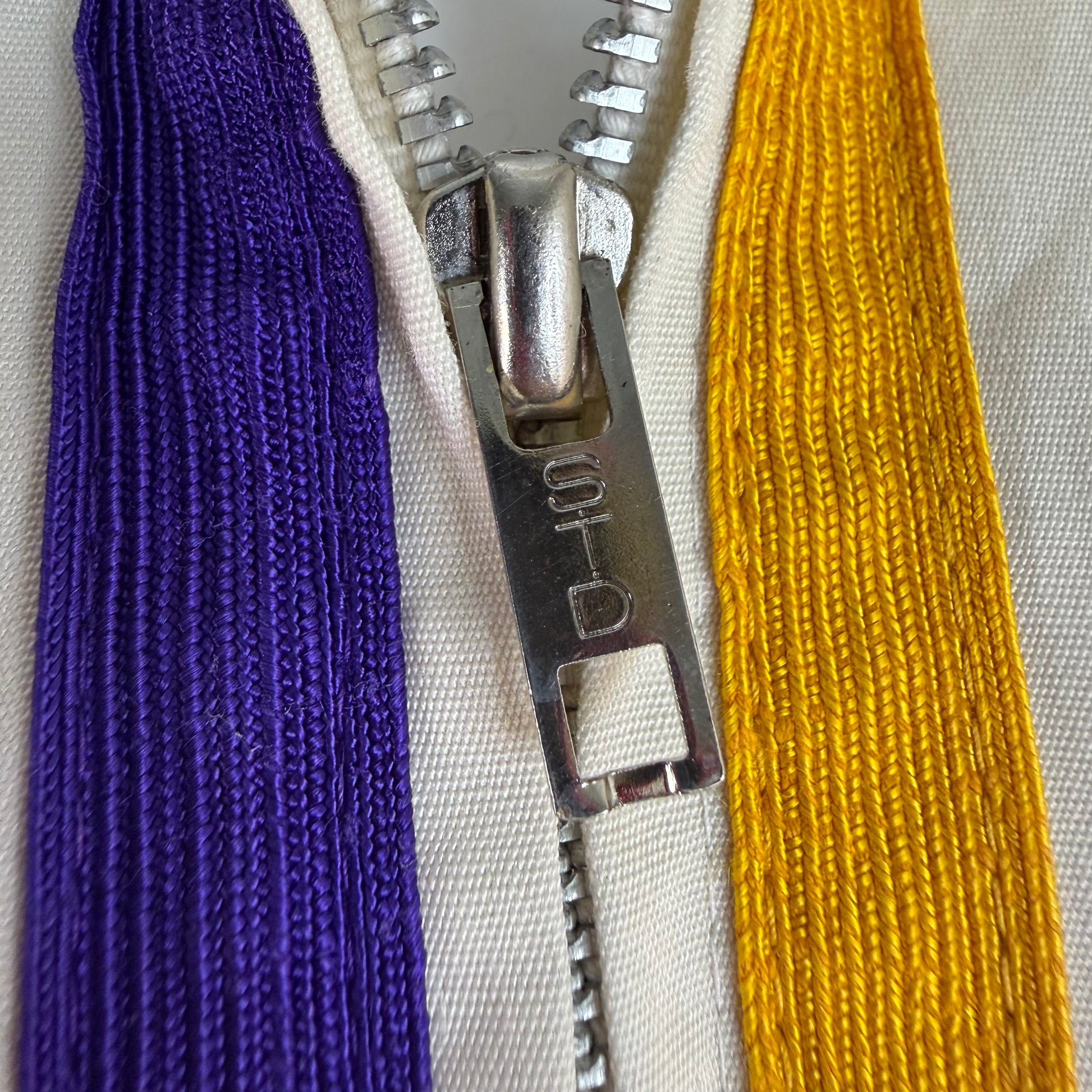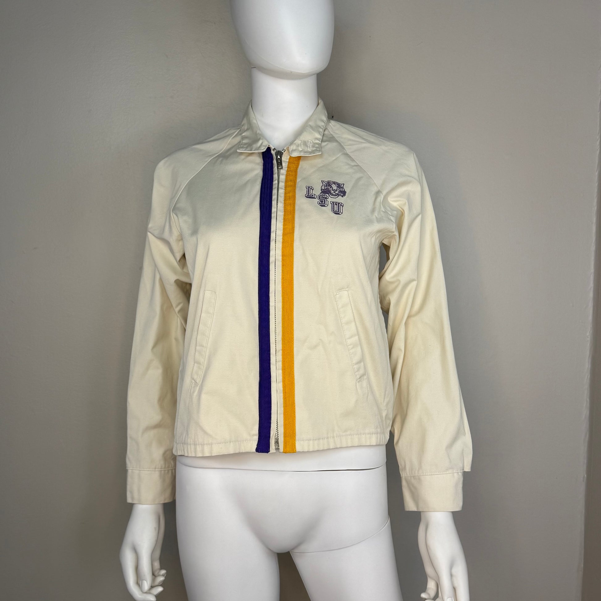 Description - Light weight Louisiana State University Tigers zip up jacket from the 60s. It has purple and gold trim next to the zipper. The collar can be worn down or standing up like a racing jacket. There are 2 buttons. There are hand warmer pockets. It is not lined.