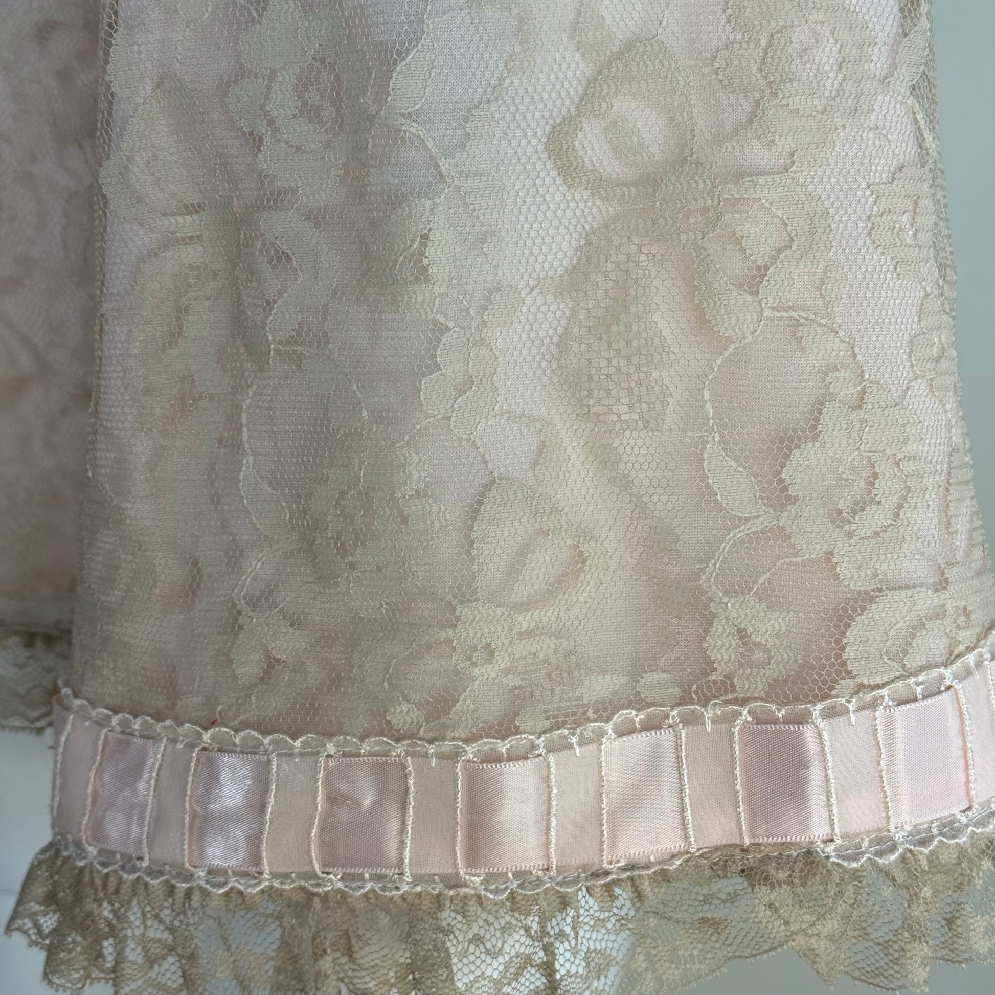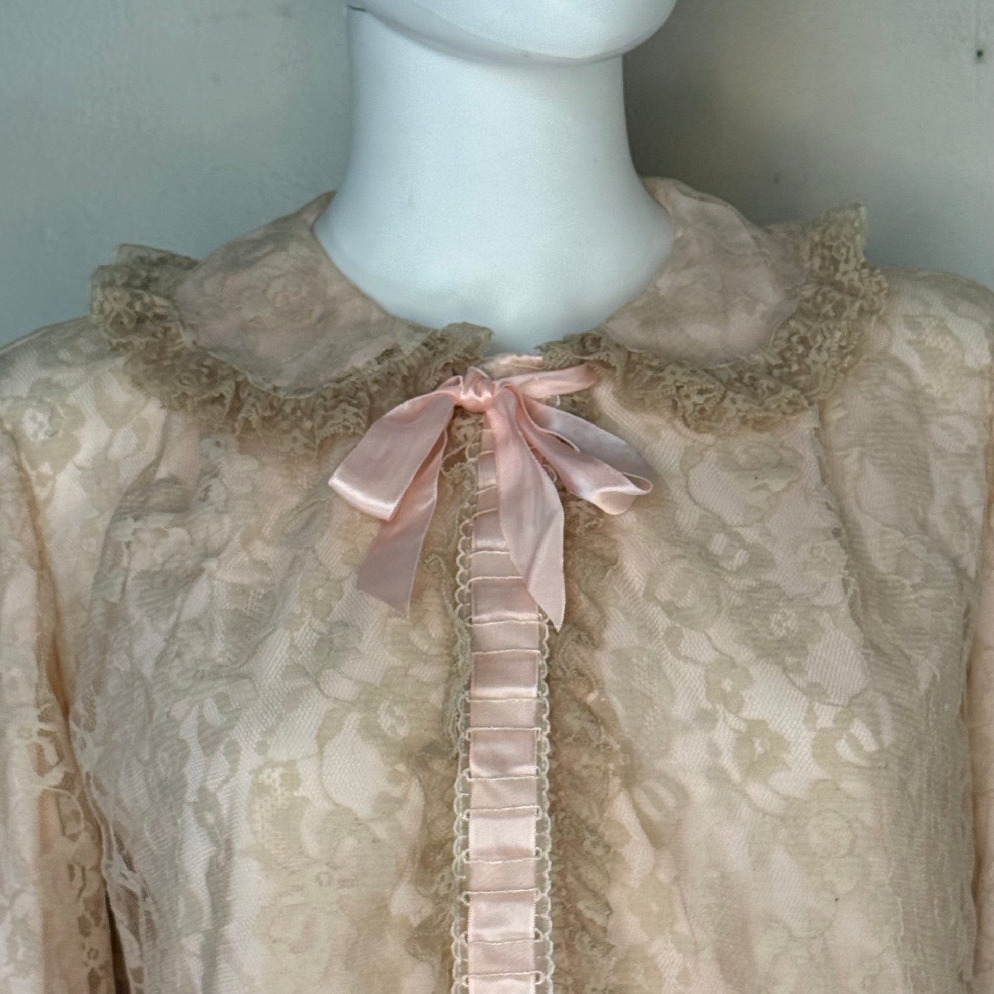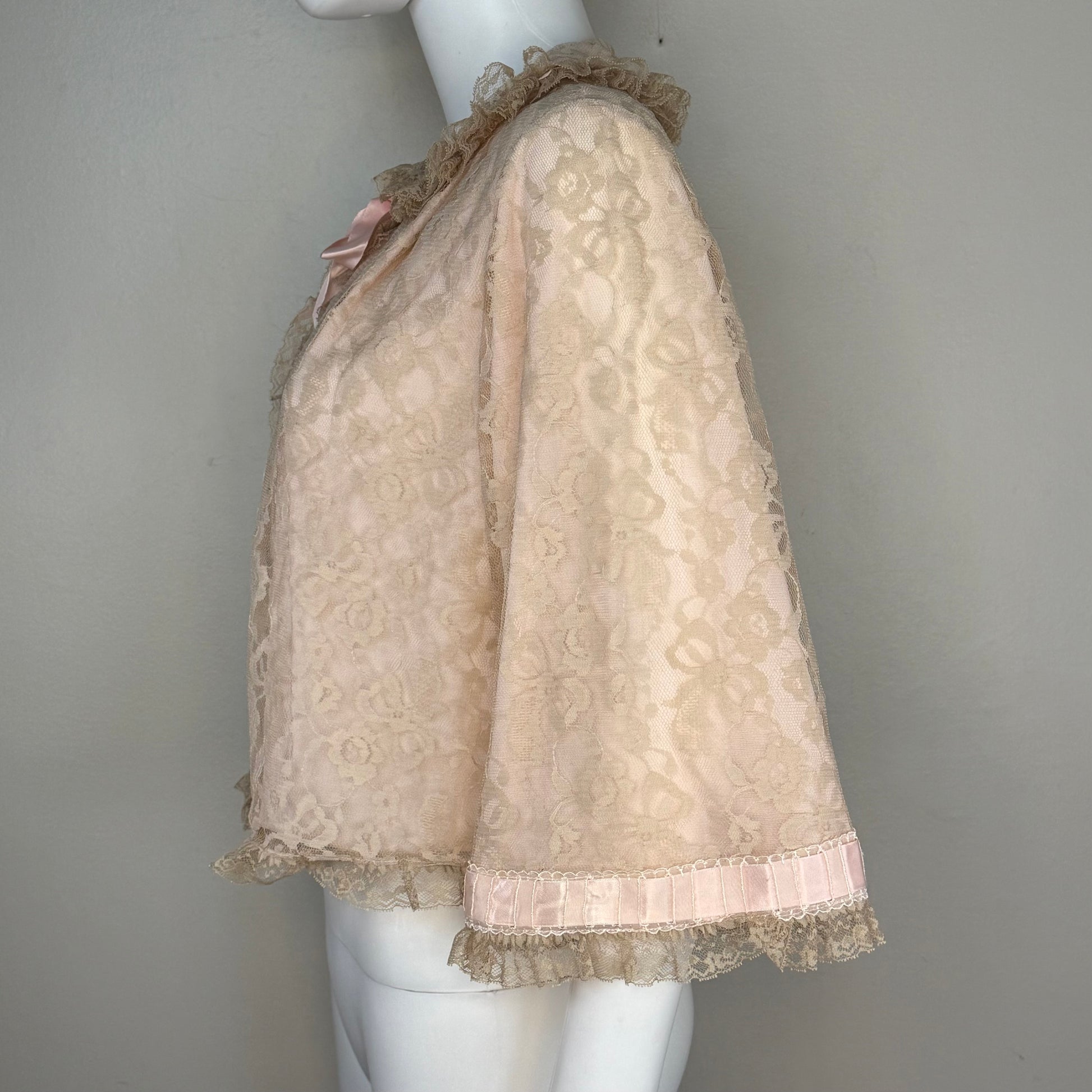 Description - Tan and pastel pink lace and nylon bed jacket from the 60s. It's a very sweet and demure coquette style that although originally designed for the bedroom would look pretty outside the house as well. It secures under the lace trimmed peter pan collar with 2 snaps and a pastel pink ribbon that you can tie into a bow. The cropped sleeves flare out.