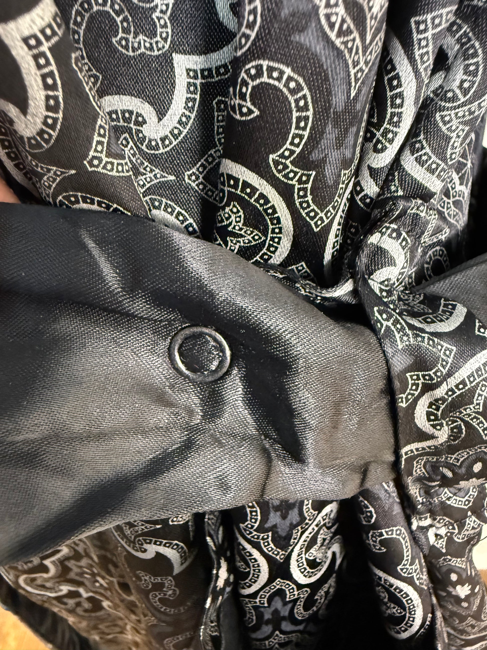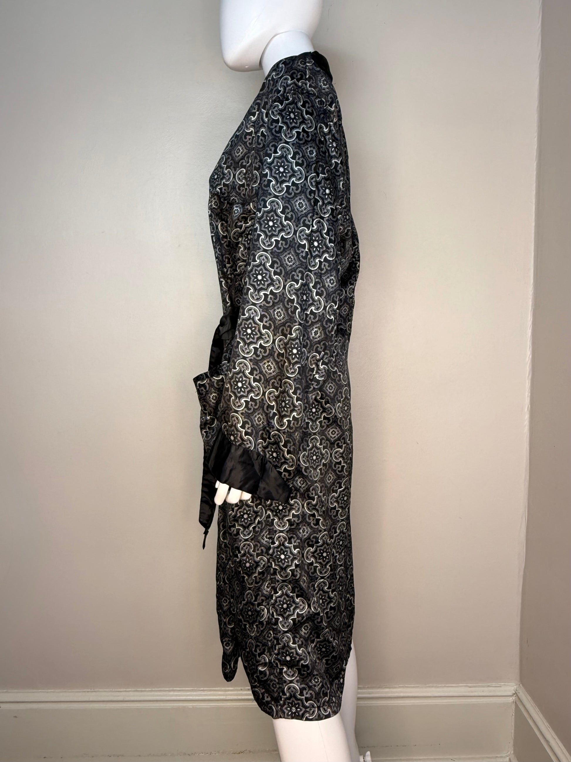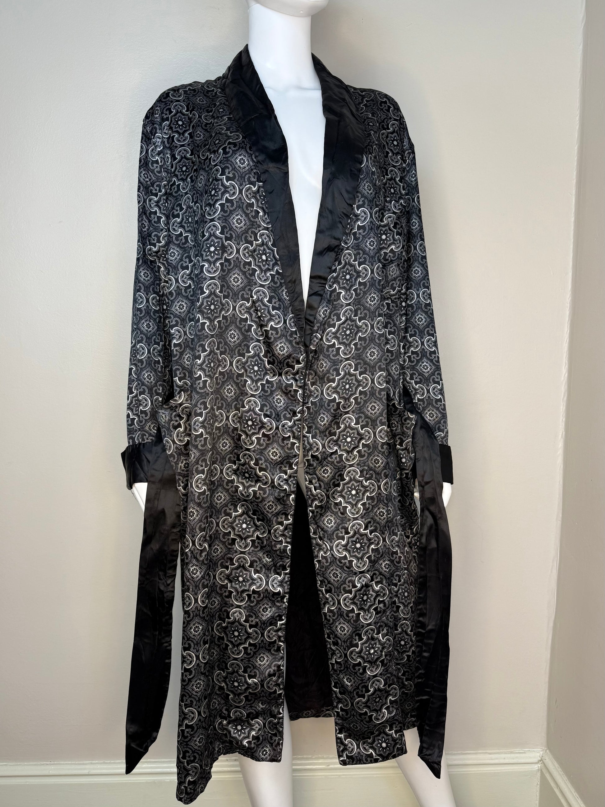 Description - Silky lounge robe from the 60s in a Black, grey, and white medallion print with black trim. It comes with a matching black belt that snaps to the robe on both sides so you don't lose it.