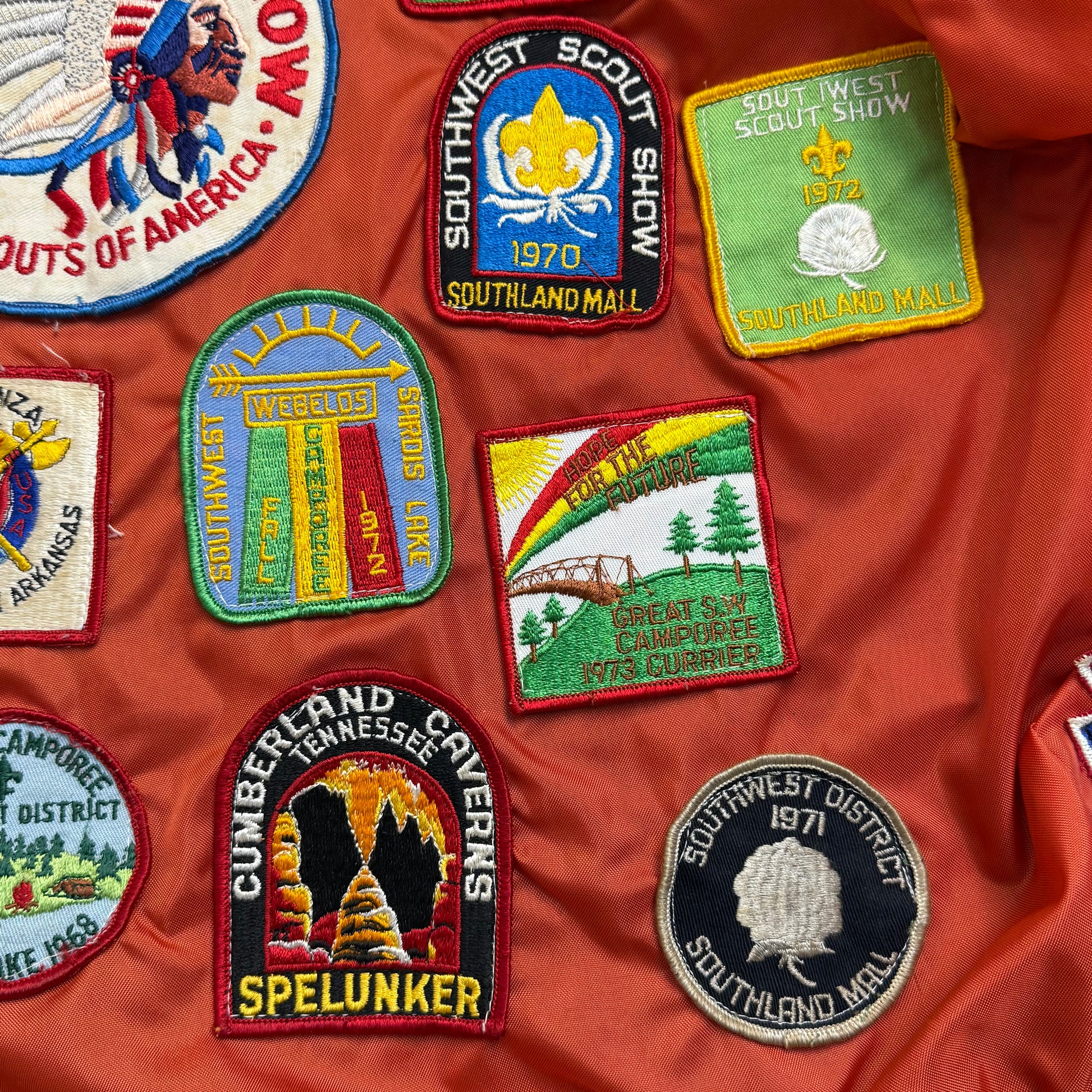 Patches include: Cumberland Caverns Caveman, Spring Camporee 1970 Enid Lake, Chickasaw Council Laboratory of Liberty Scout Show Apr 71, Southwest District Fall camporee 1969, Southwest Webelos Spring Camporee May 1972, Chucalissa Discovery Trail, Apr 13 14 Southing Today's Youth Tomorrows Leaders, Tennessee State Parks Camper Meeman Shelby Forest, SW Fall Camporee 1974, Memphis Tennessee Historical Trail, Schirra Eisele Cunningham VII, Scouting Minutemen of Today Chickasaw Council Apr 1970, Shiloh Military Trail, Chickasaw Council Kamp Kia Kima, Southwest Scout Show 1973 Southland Mall, Shiloh Artillery Trail, SW Fall camporee Sardis 1971, Chickasaw Council Festival of Scouting April 1974, The Great Southwest Spring camporee 1973, Camporee SW District Spring 1971, Scouting A Mirror of the Future Chickasaw Council 1972, SW Spring Camporee 1972, Chickasaw Council Camporee Southeast District Memphis Tennessee 1970, Order of the Arrow Boy Scouts of America, Southwest Scout Show Southland Mall 1970, Southwest Scout Show Southland Mall 1972, Southwest Fall District Camporee 1972, Scout Show April 1969 Scouting Power, Esperanza Trail Crittenden County Arkansas, Webelos Southwest Camporee Sardis Lake Fall 1972, Hope for the Future Great SW Camporee 1973, Overton Zoological Trail, Scouting Laboratory of Liberty April 1971 Chickasaw Council, Spring Camporee Southwest District Enid Lake 1968, Cumberland Caverns Tennessee Spelunker, and Southwest District 1971 Southland Mall