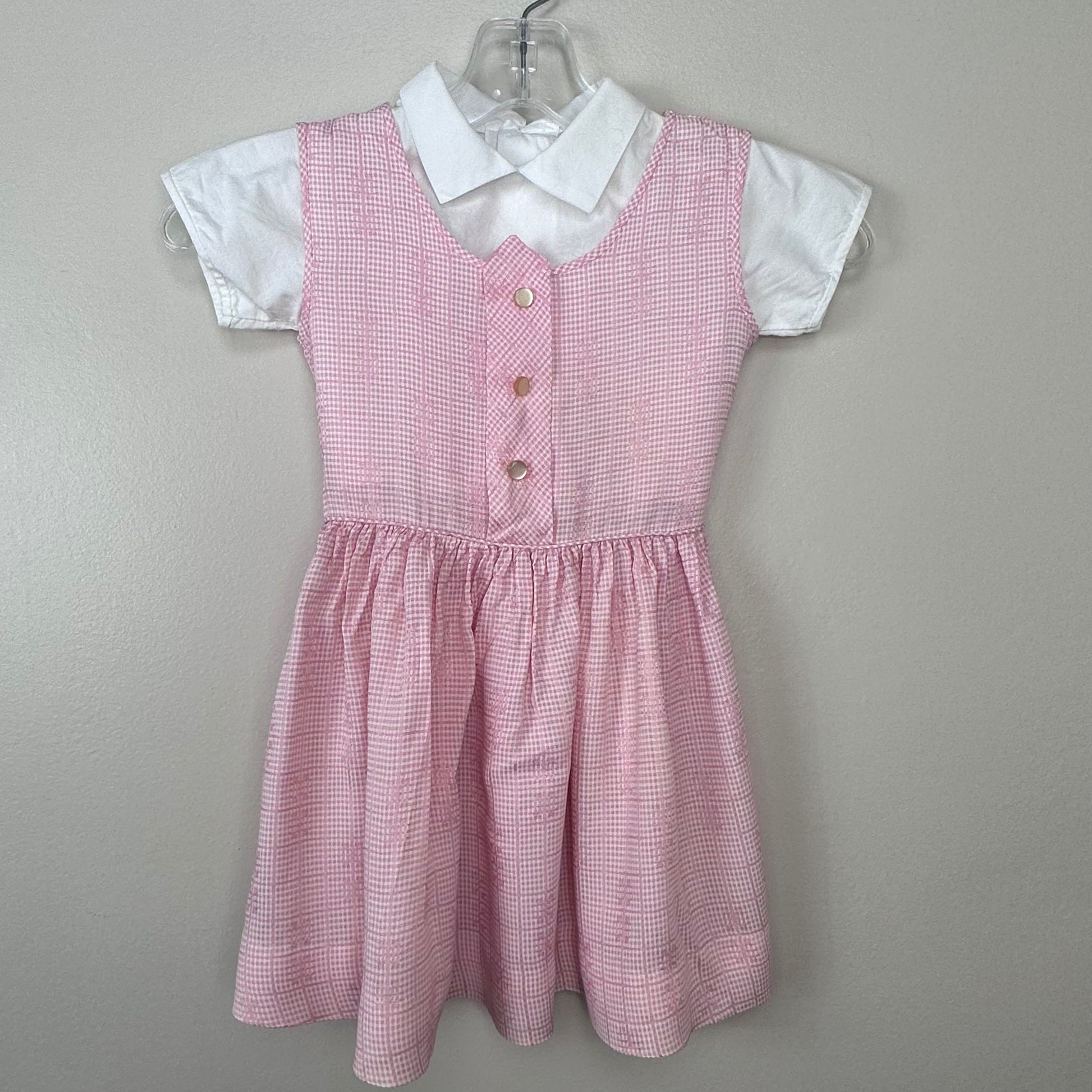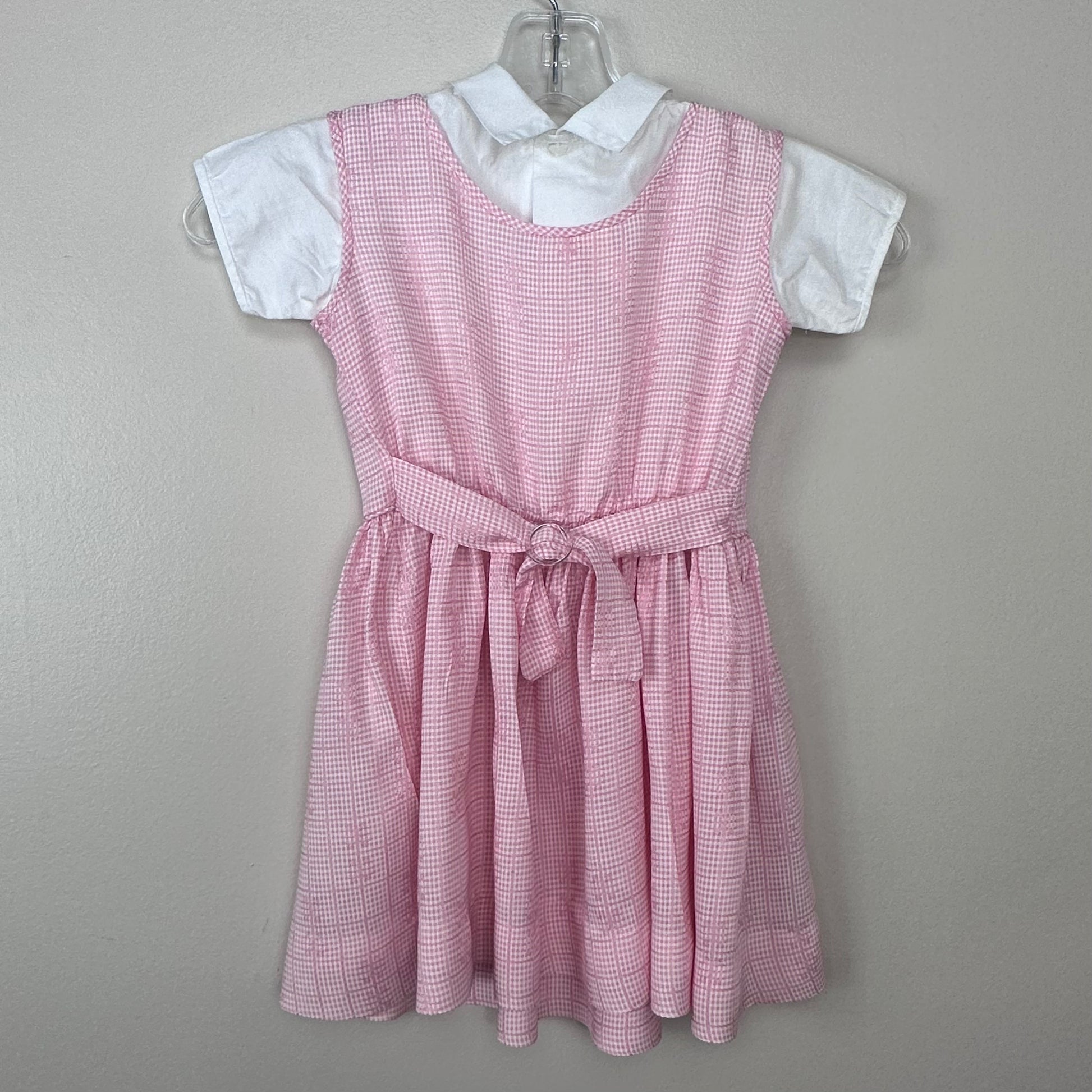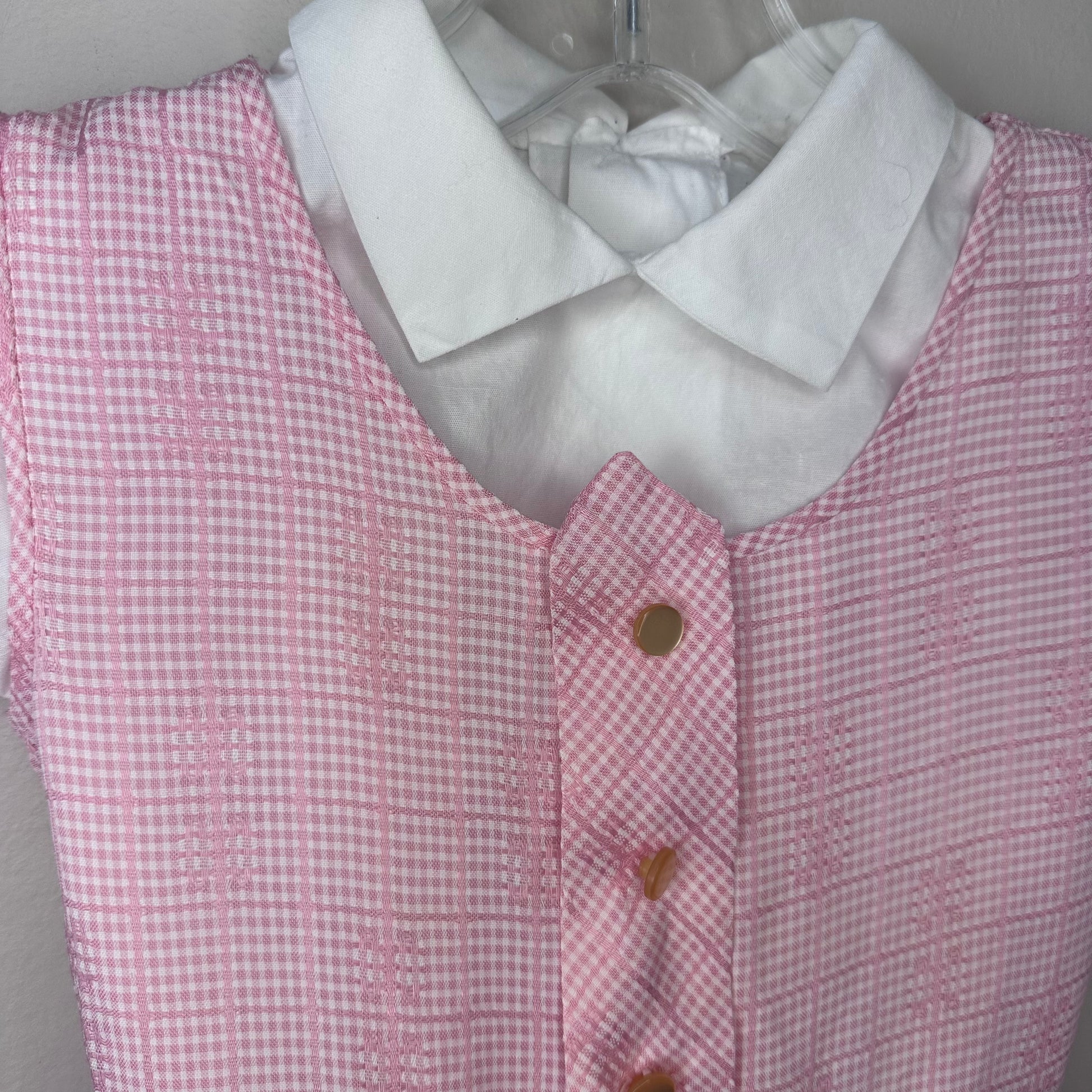 Description - Pink sleeveless jumper that comes with a white blouse. It could also be worn on its own as a sleeveless dress. The jumper pulls over your head. There are no openings but it has elastic in the waist. It has an attached belt with a plastic slide buckle. The blouse is cropped because only the top of it shows under the jumper. It buttons up the back.