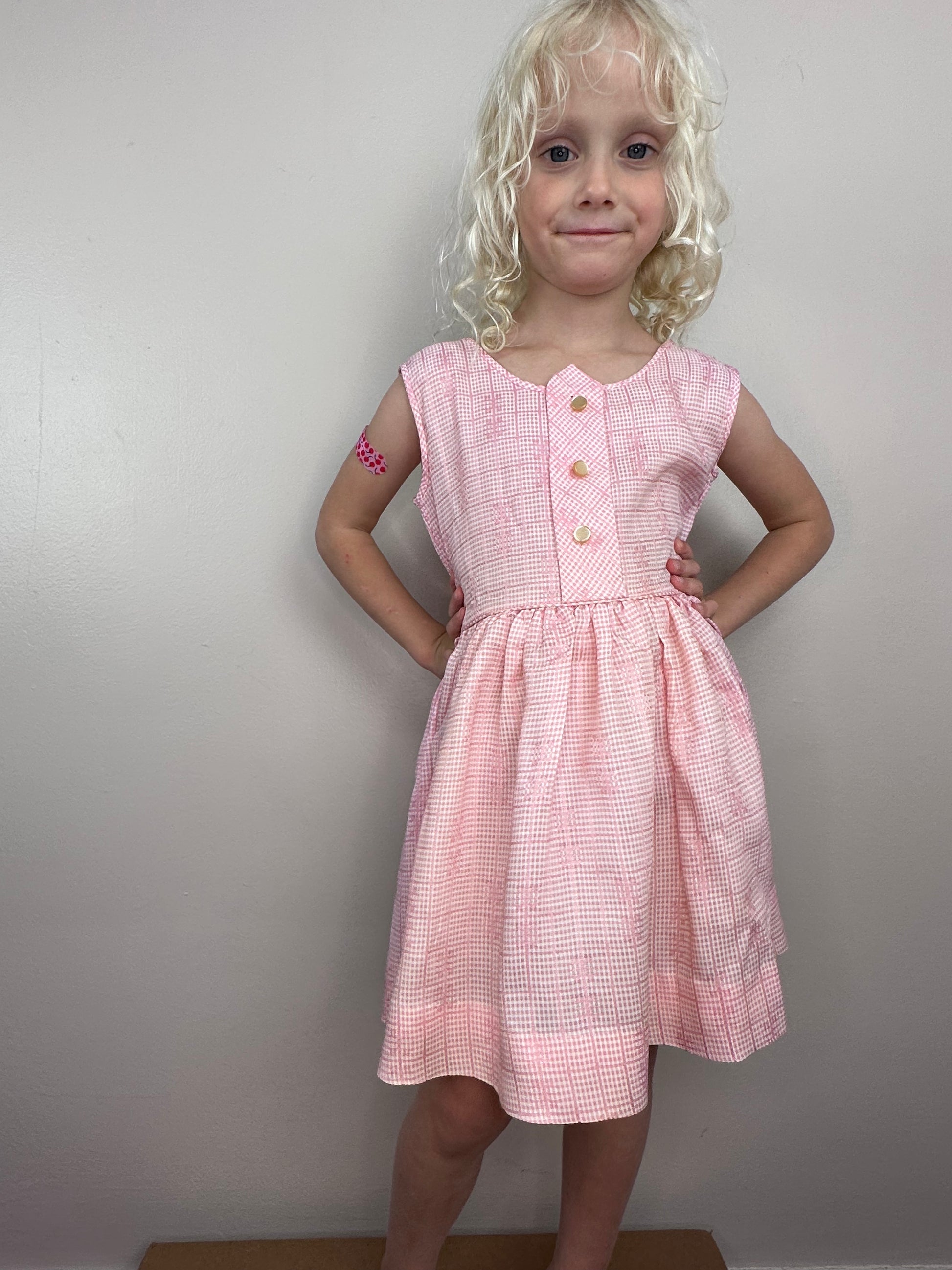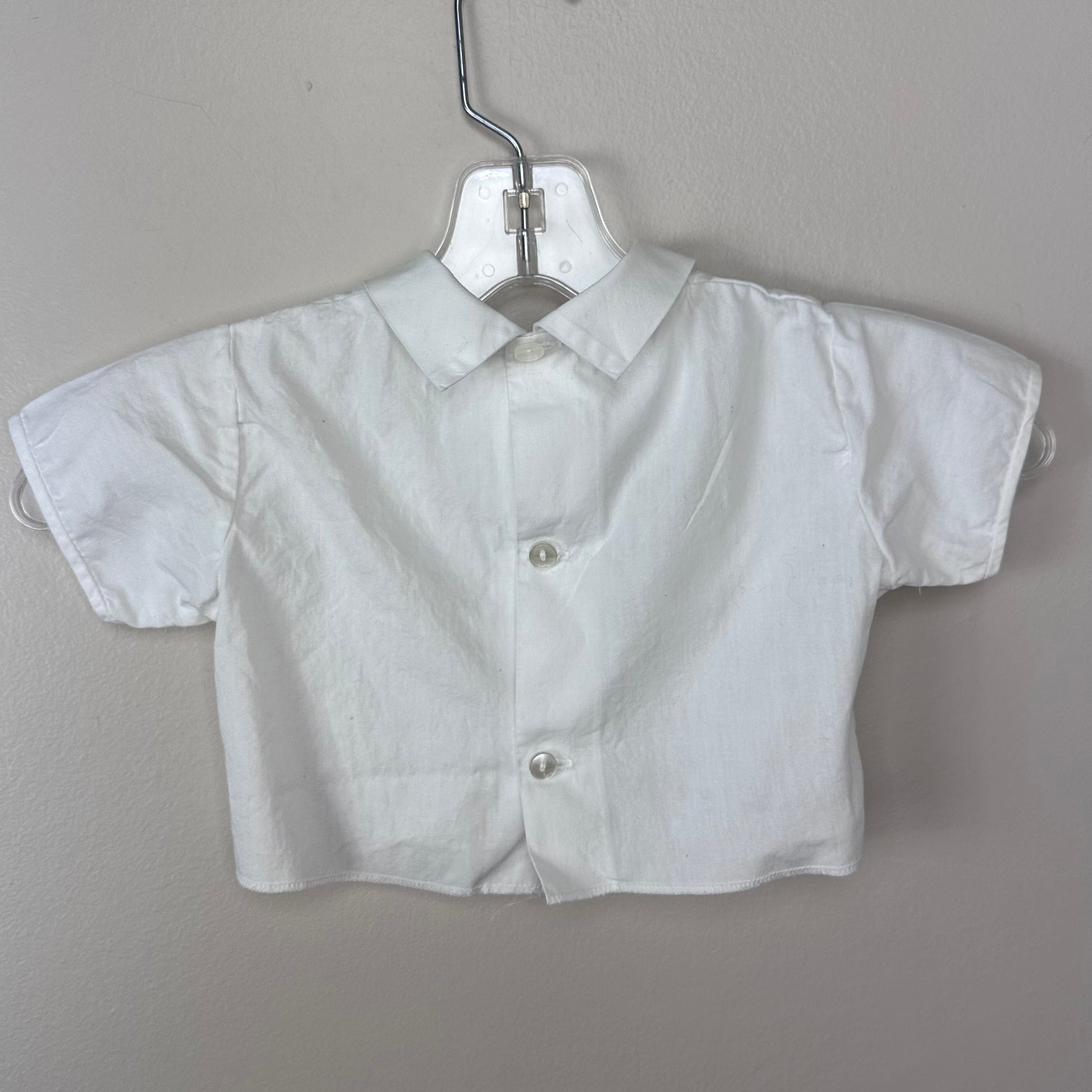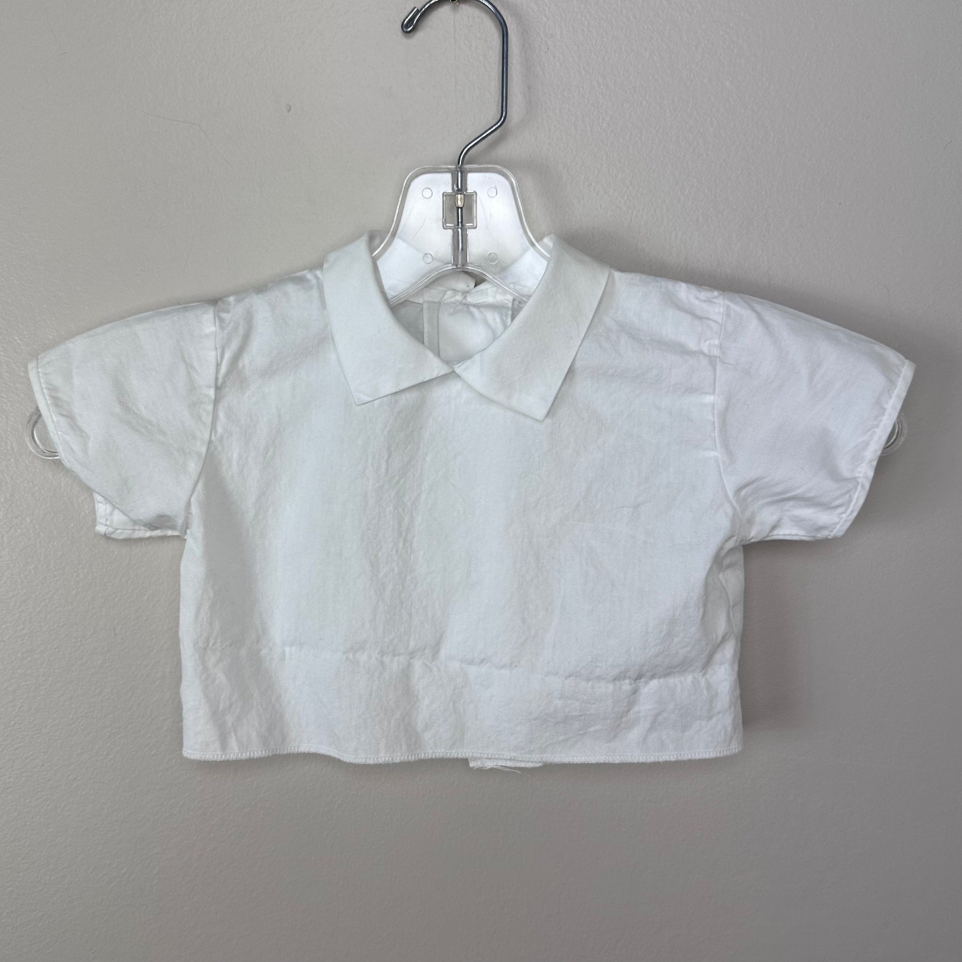 Description - Pink sleeveless jumper that comes with a white blouse. It could also be worn on its own as a sleeveless dress. The jumper pulls over your head. There are no openings but it has elastic in the waist. It has an attached belt with a plastic slide buckle. The blouse is cropped because only the top of it shows under the jumper. It buttons up the back.