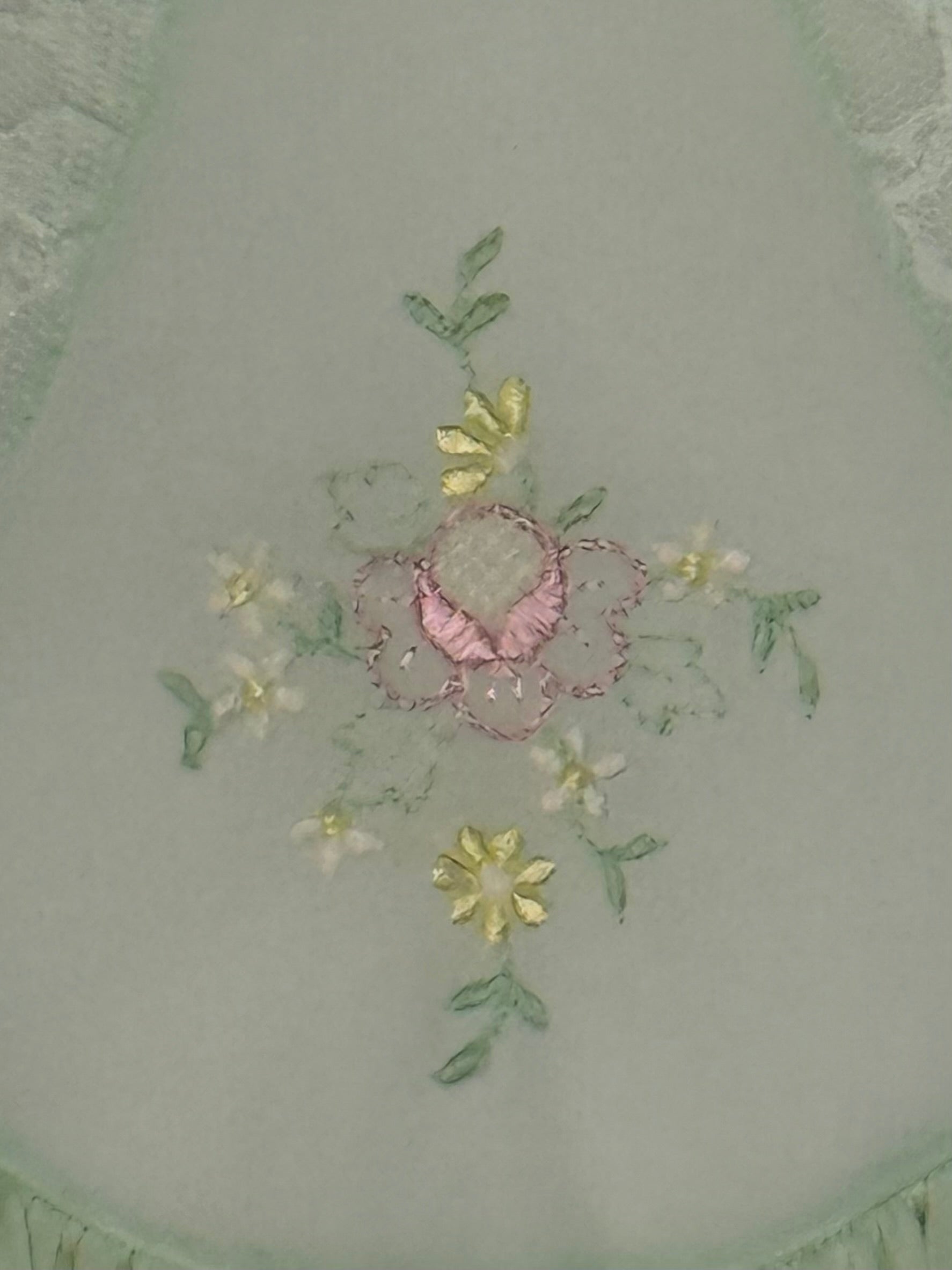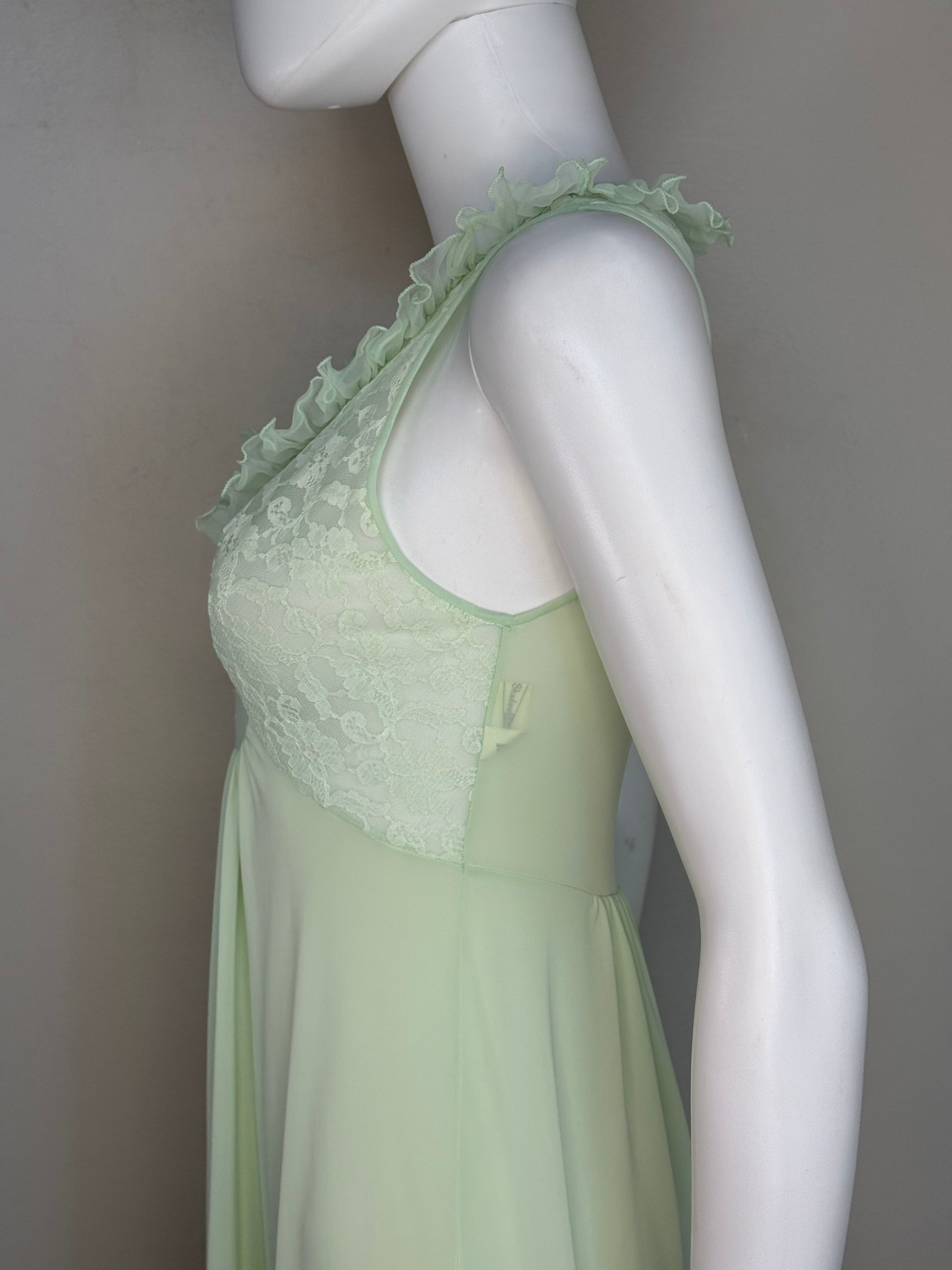 Description - Pretty feminine full length pastel mint green sheer nylon nightgown from the 70s. It has an empire waist with pretty floral embroidery on the bodice.