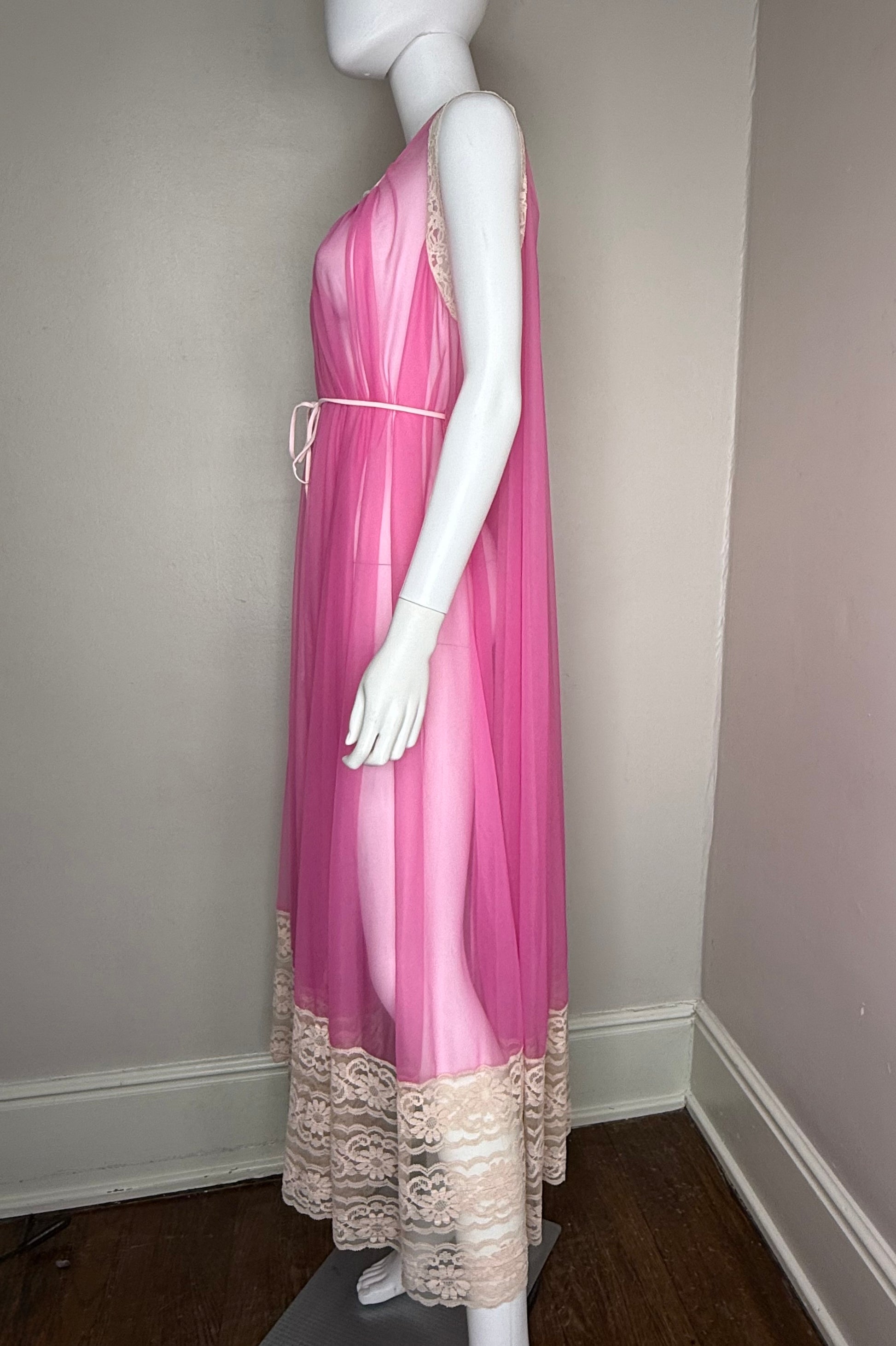 Description - Dramatic sheer pink nightgown from the 60s with a massive sweep. There are slits on each side of the waist for a belt to go through and cinch it in in the front. You could wear it without the belt as well as more of a caftan style.